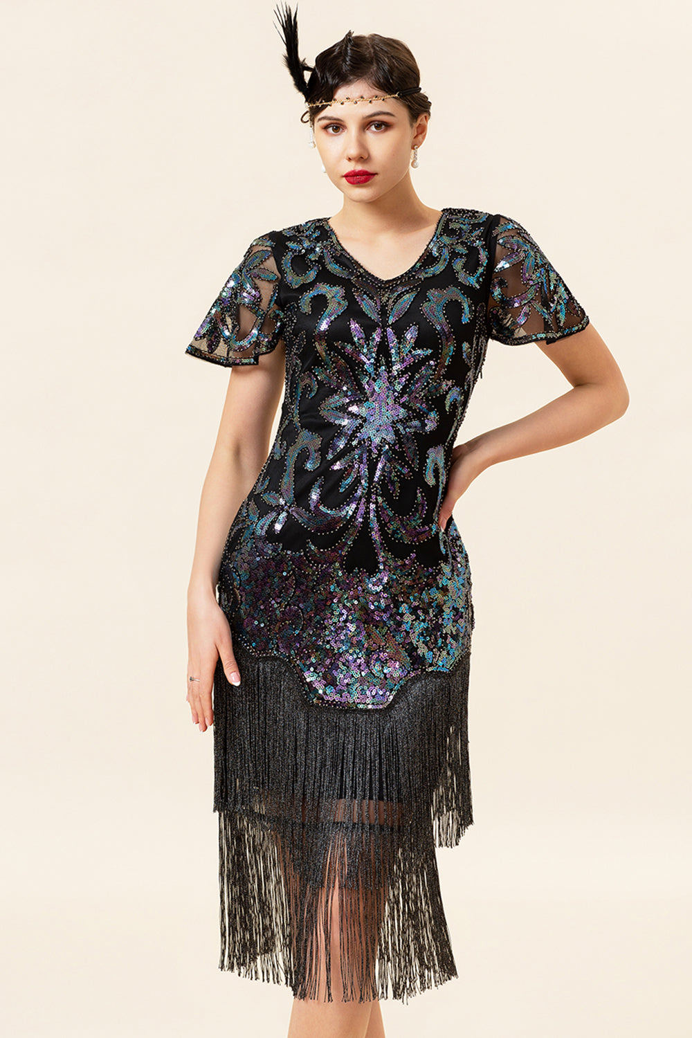 Svarta Paljetter Fransad Gatsby Klänning Med 20-Tals Tillbehör Set
