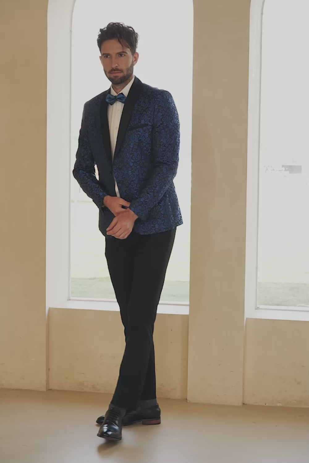 Blå Sjal Lapel Jacquard En Knapp Herrbal Kavaj