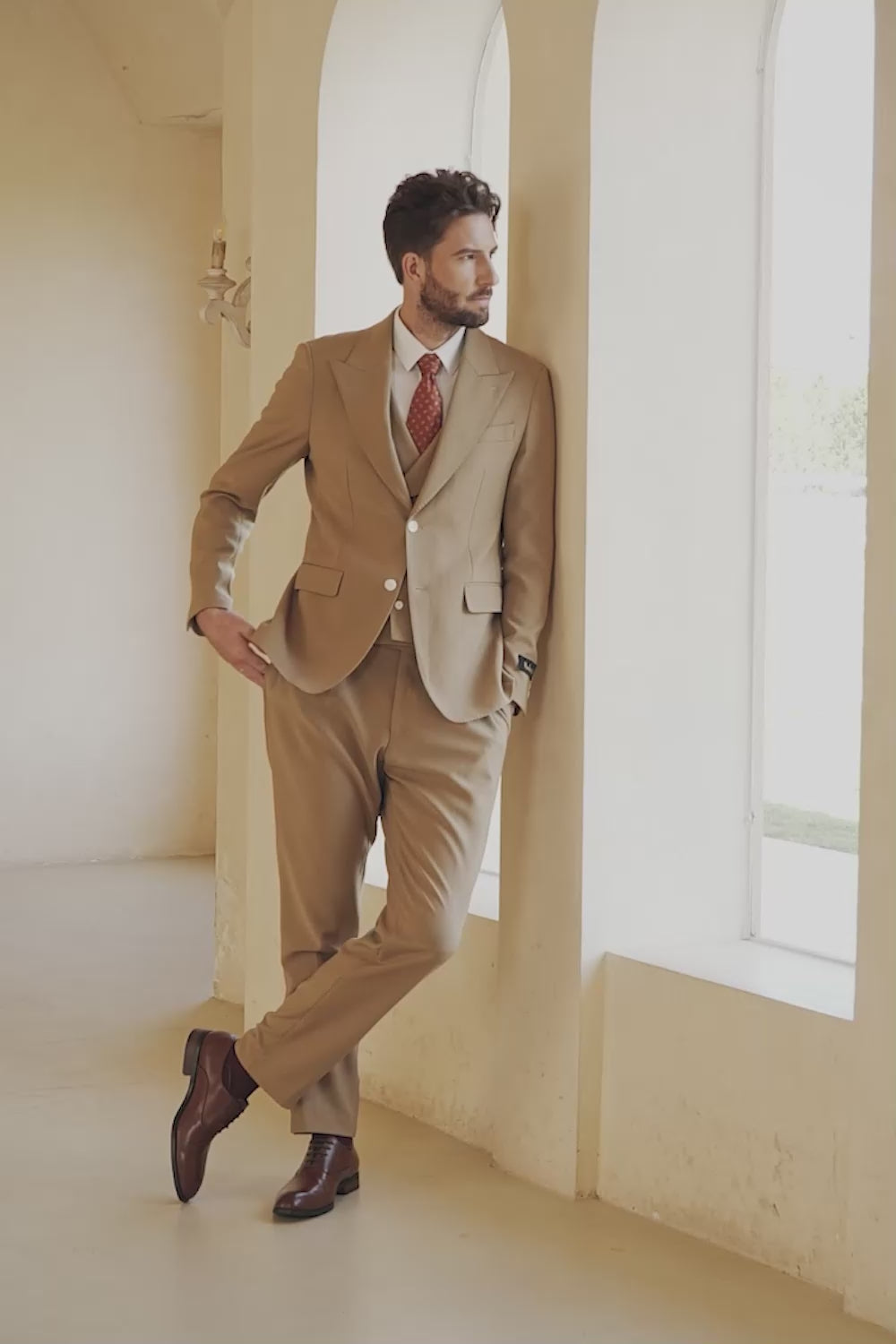 Brun 3-Delad Peaked Lapel Two Button Bröllopskostym Herr