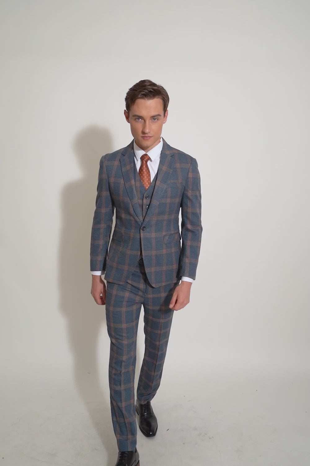 Grå Blå 3-Delat Rutiga Skårade Lapel Kostym Herr