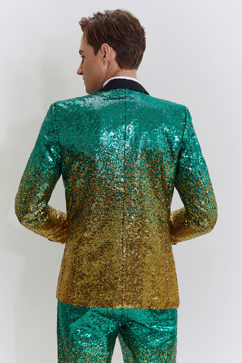 Guldgröna Herr 2-Delat Peak Lapel Paljett Kostym Herr