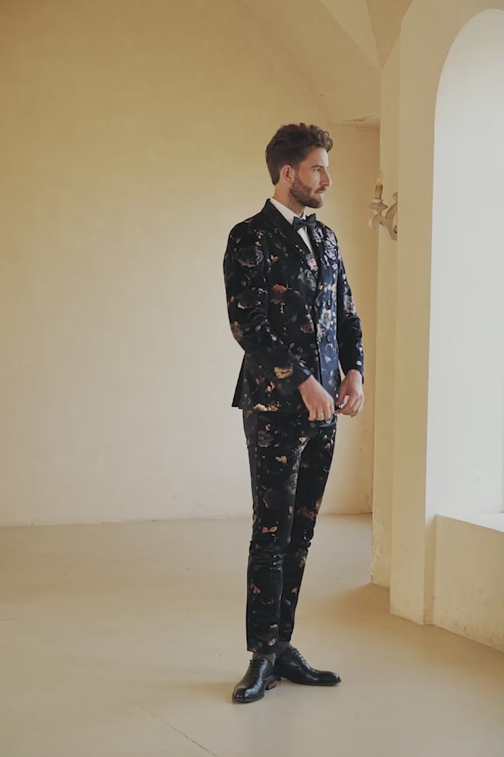 Svart 3-Delad Printed Double Breasted Peaked Lapel Kostym Herr