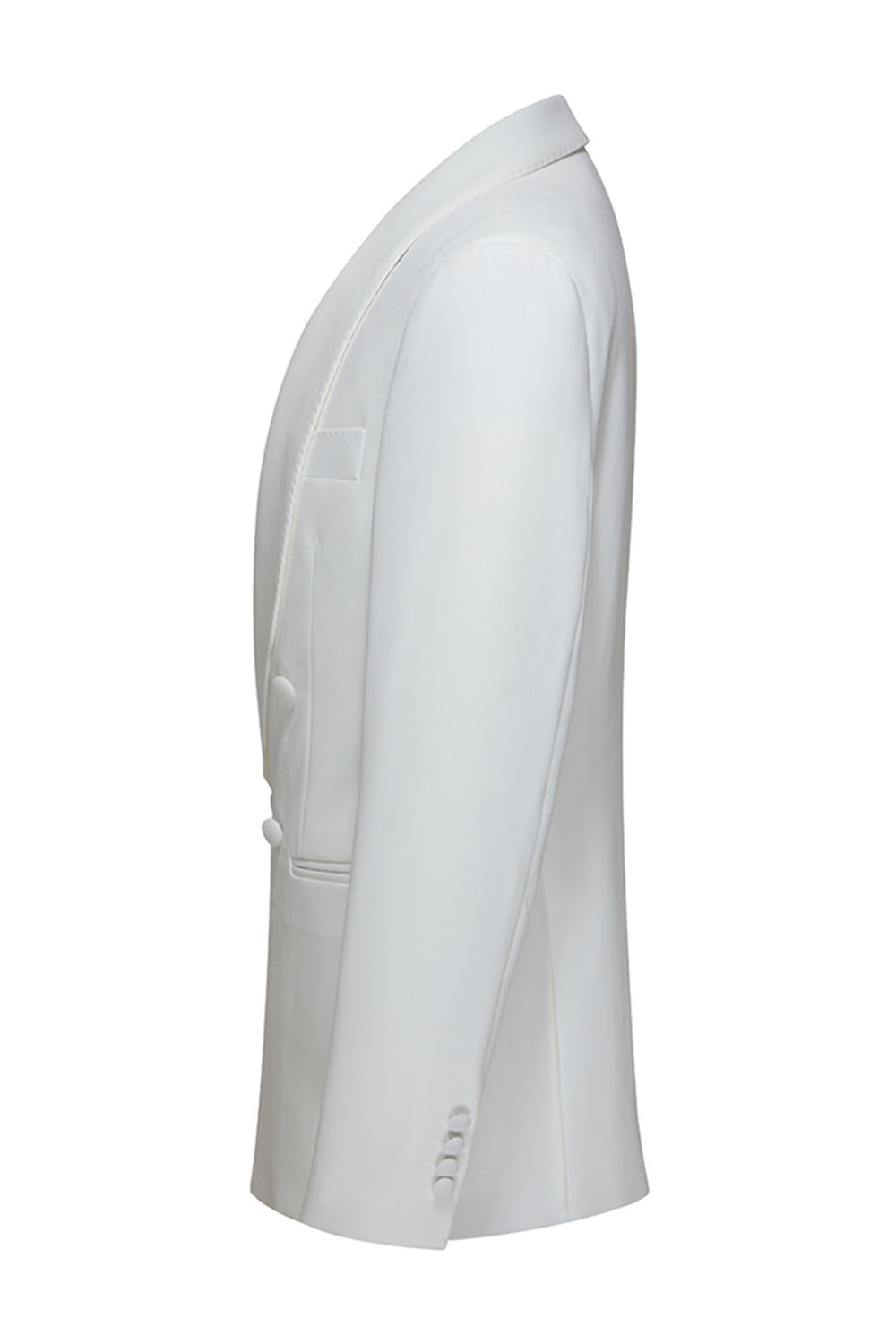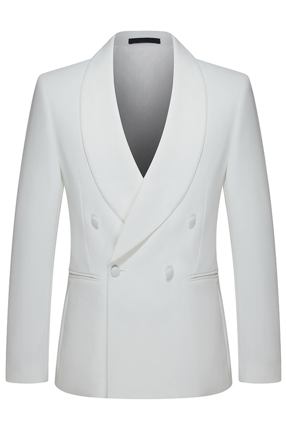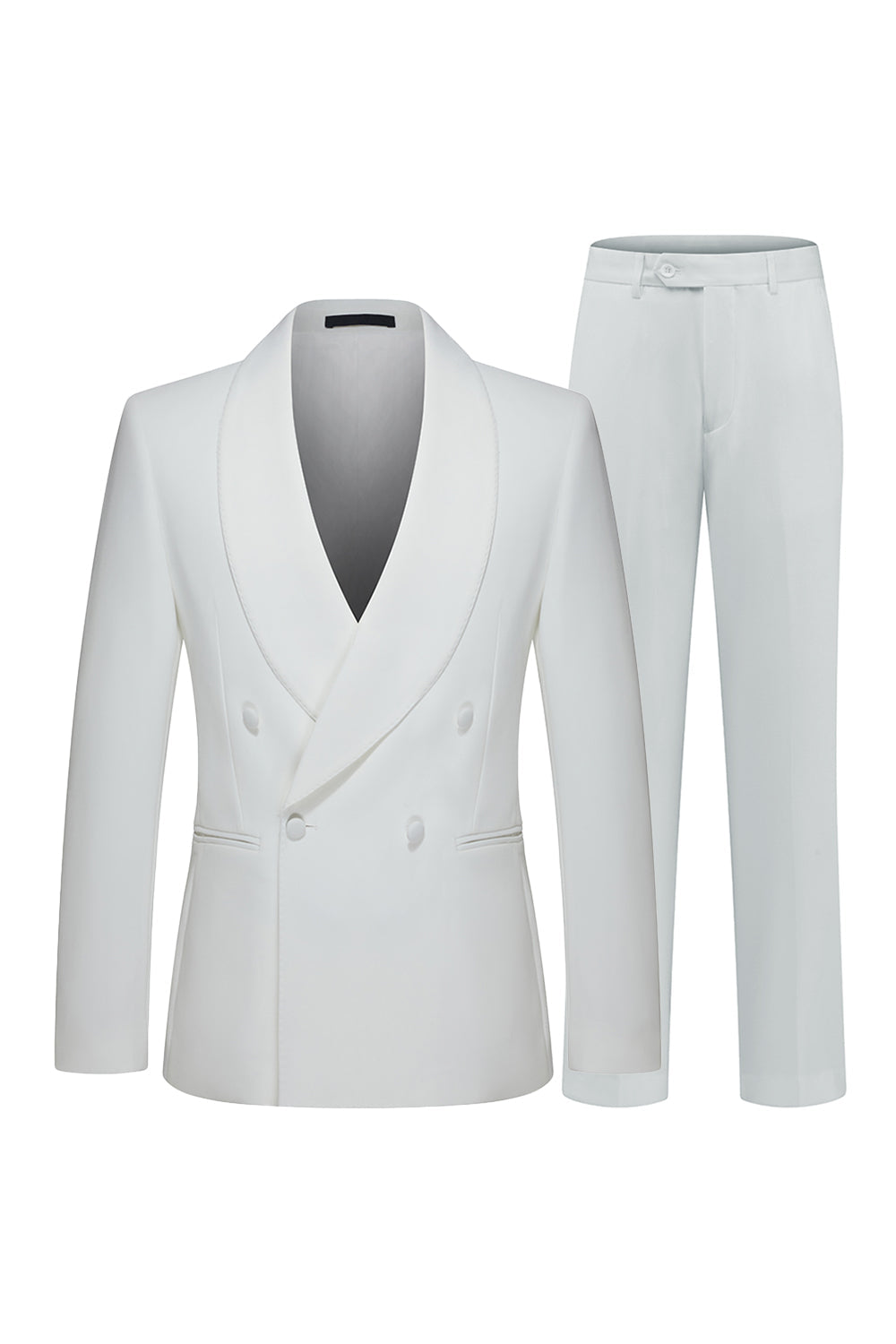 Vita tvådelade herrsjal-kavajslag dubbelknäppta bröllopskostymer