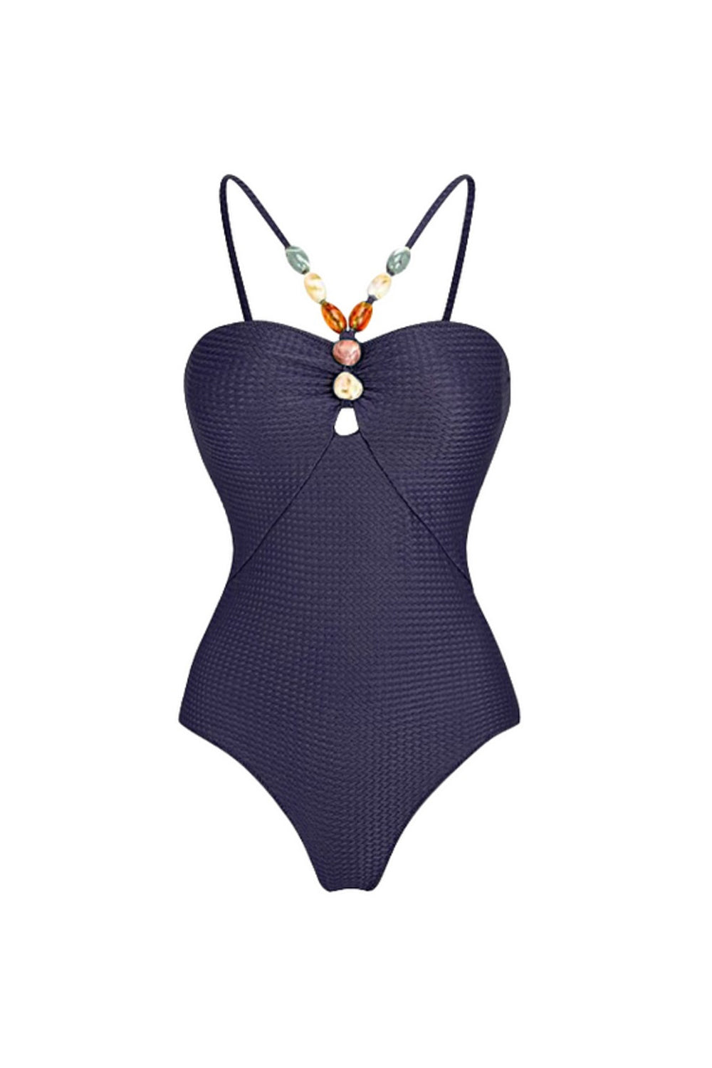 Marinblå spaghettiband, tvådelad baddräkt med pärlklädsel och täckklänning