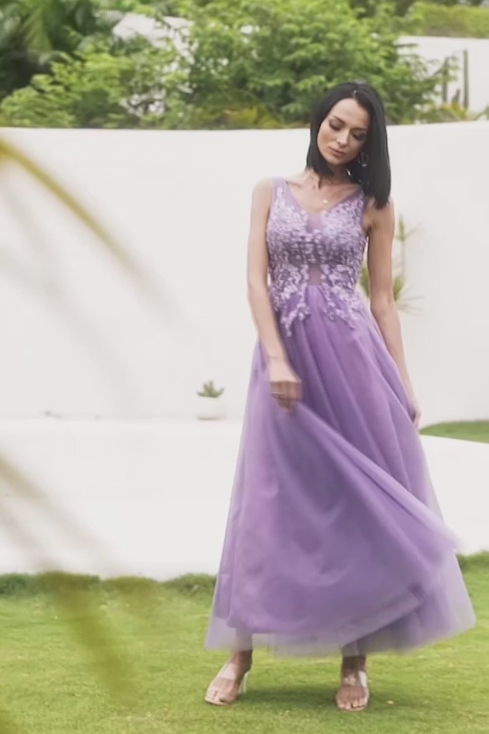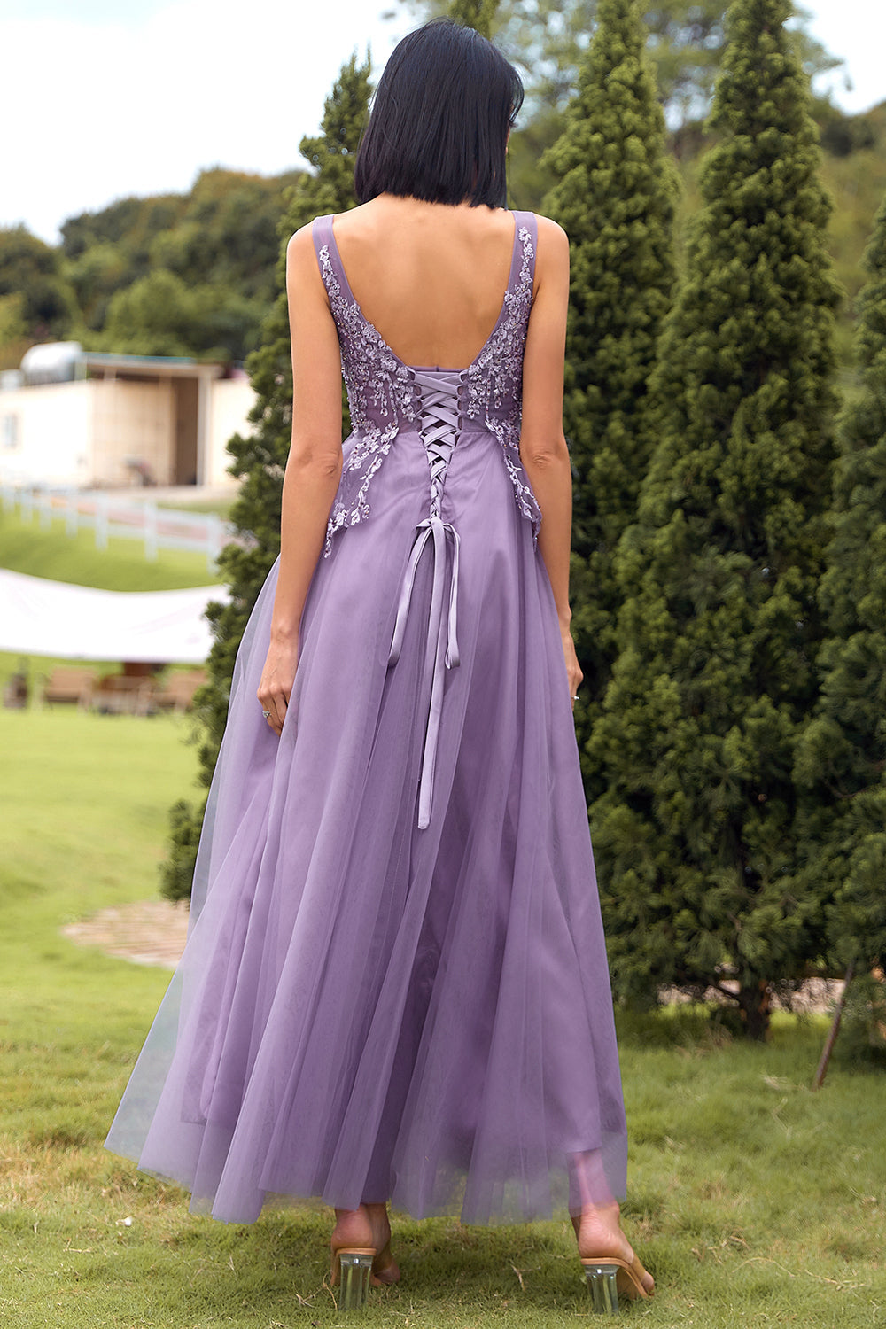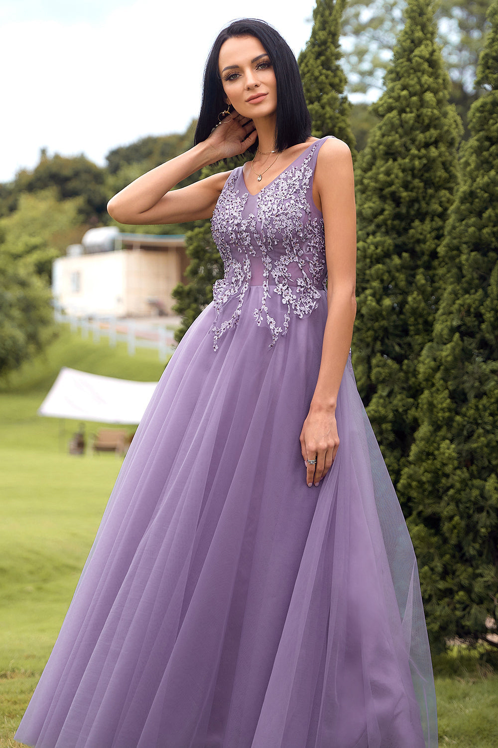 A-linje V-ringad Lila Lång Balklänning med applikationer