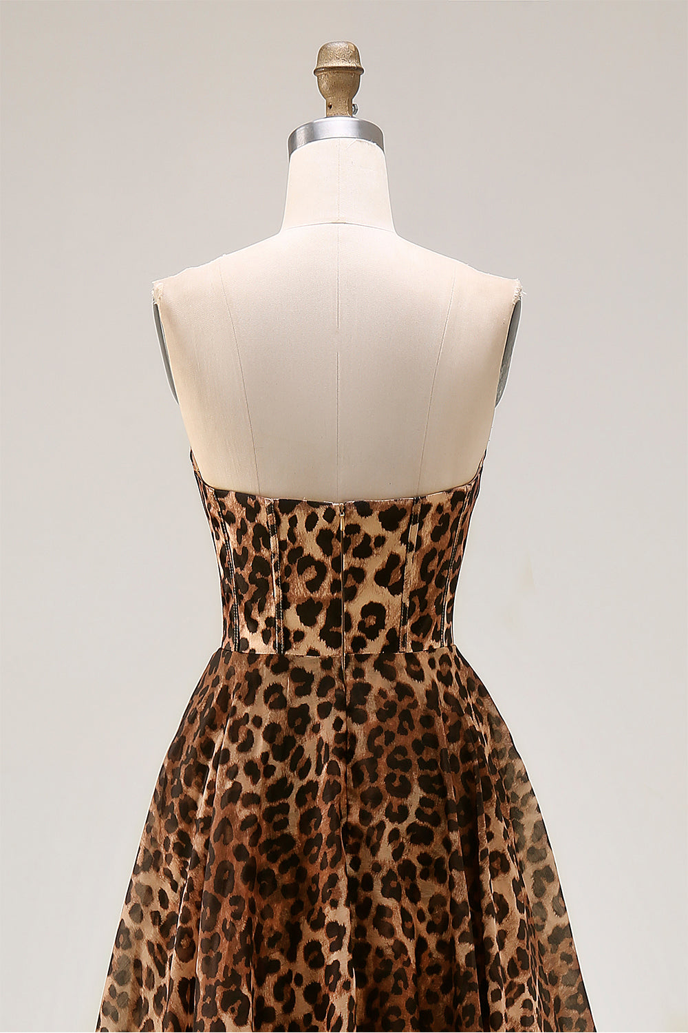 Axelbandslös Brun Leopard A-linje Korsett Lång Balklänning med Slits