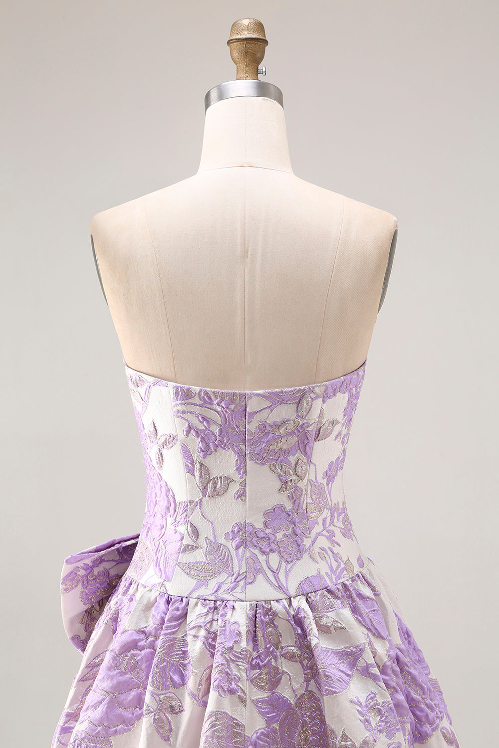 Axelbandslös lila A-linje Jacquard brokad lång balklänning med rosett