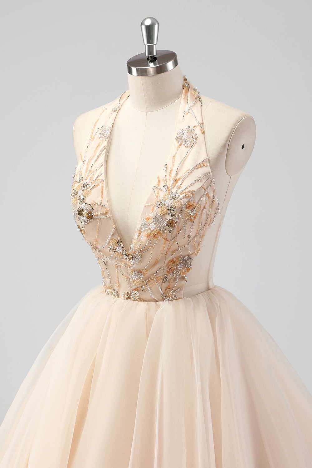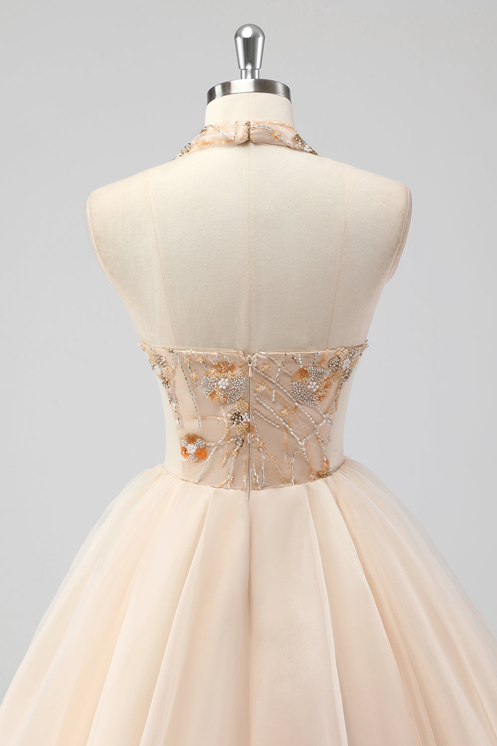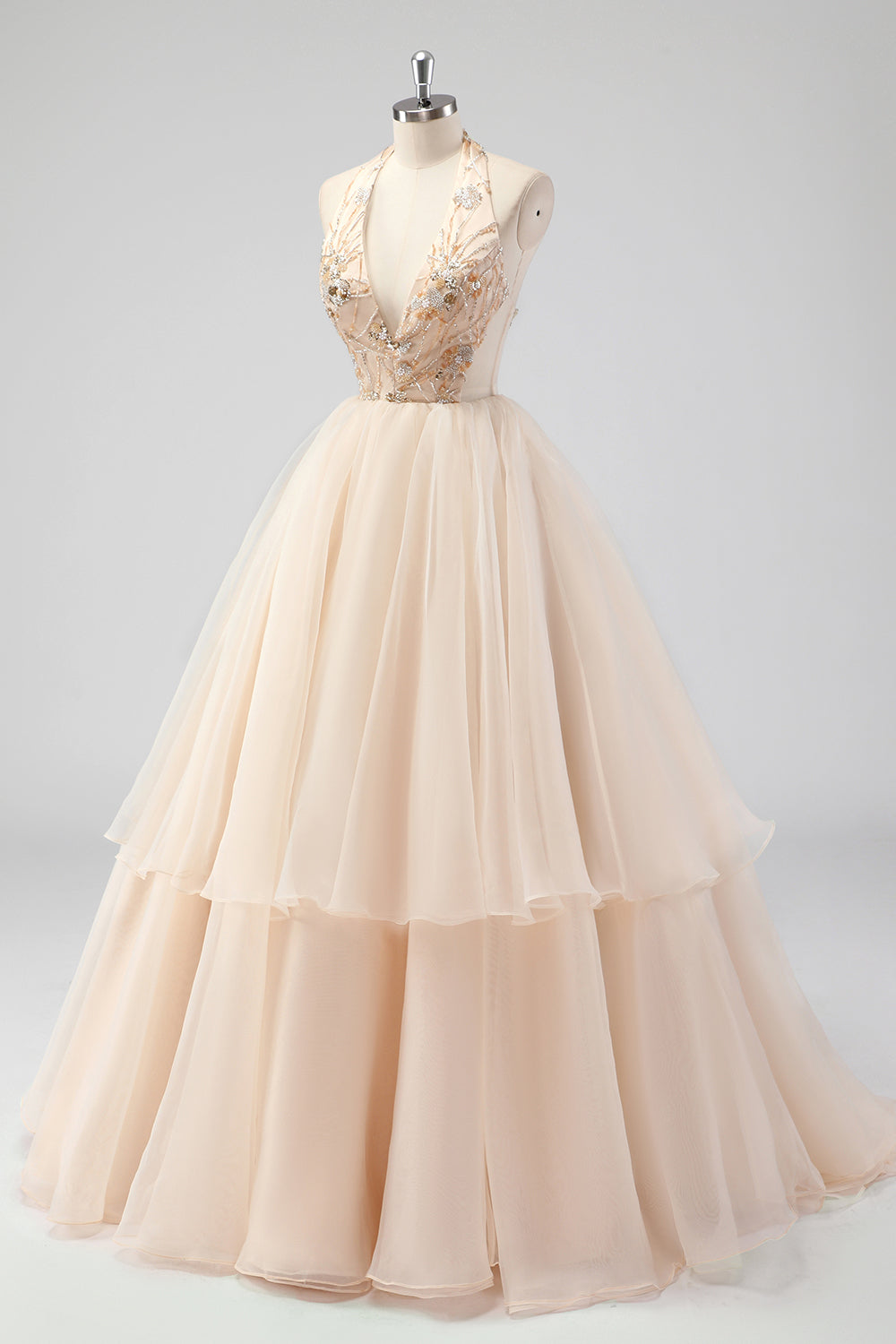 En linje Tiered Champagne Halter pärlstav formell klänning