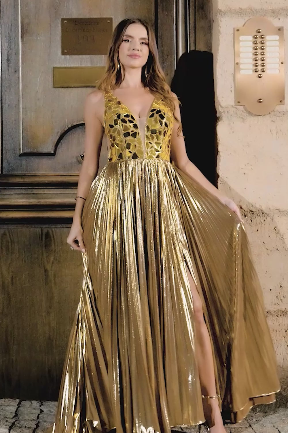 Fantastisk A Line V-ringad Gyllene Lång Balklänning med Delad Front