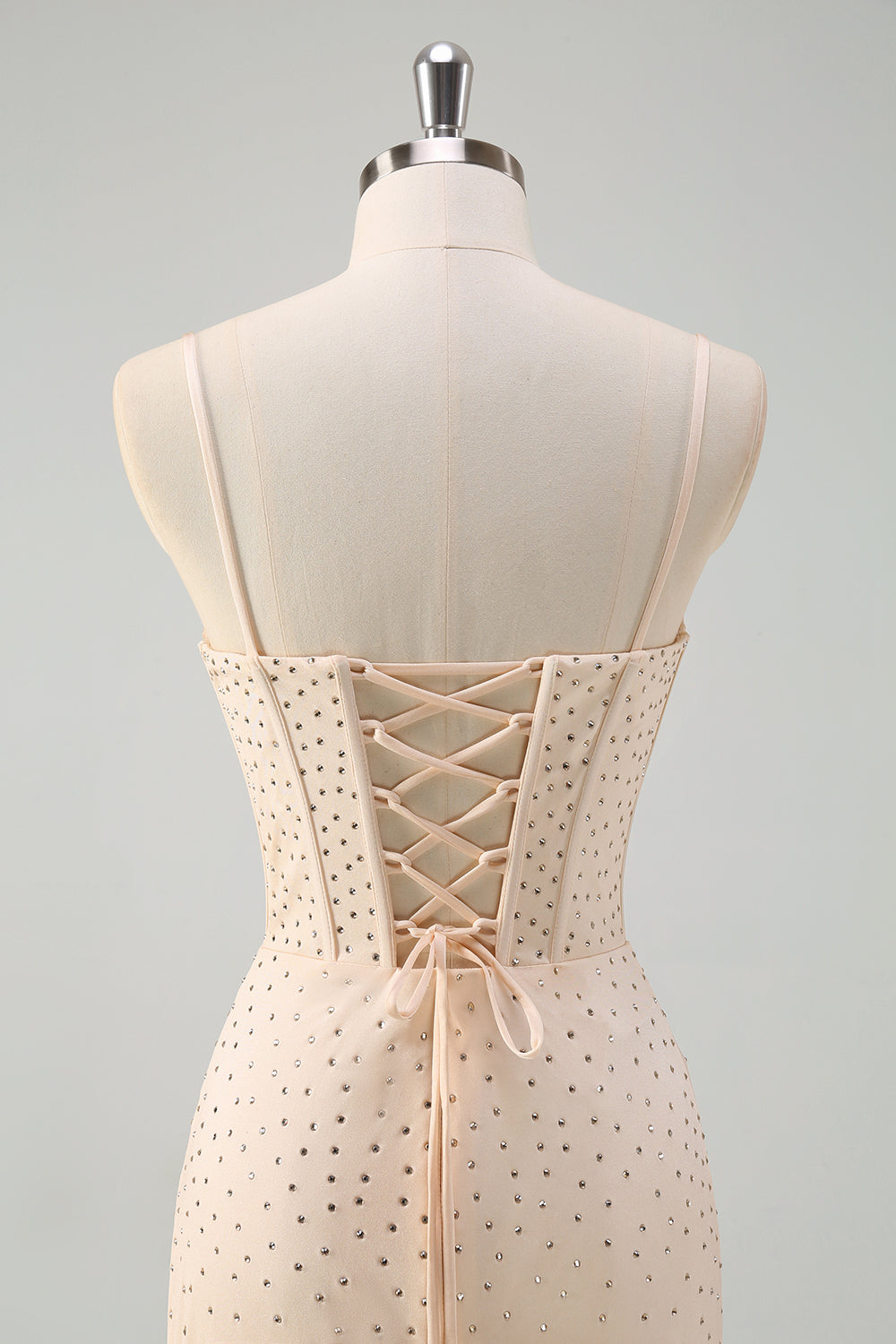 Glitter Gul Sjöjungfru Spaghetti Remmar Pärlstav Lång Korsett Balklänning med Slits
