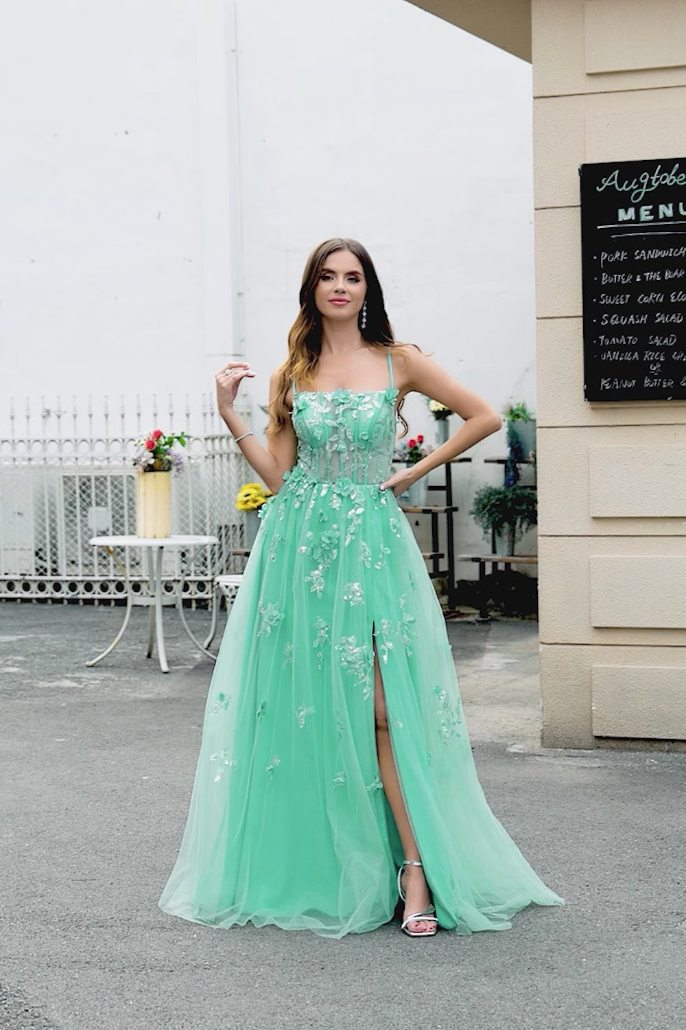 Grön A-linje Spaghetti Remmar Lång korsett Balklänning med applikationer