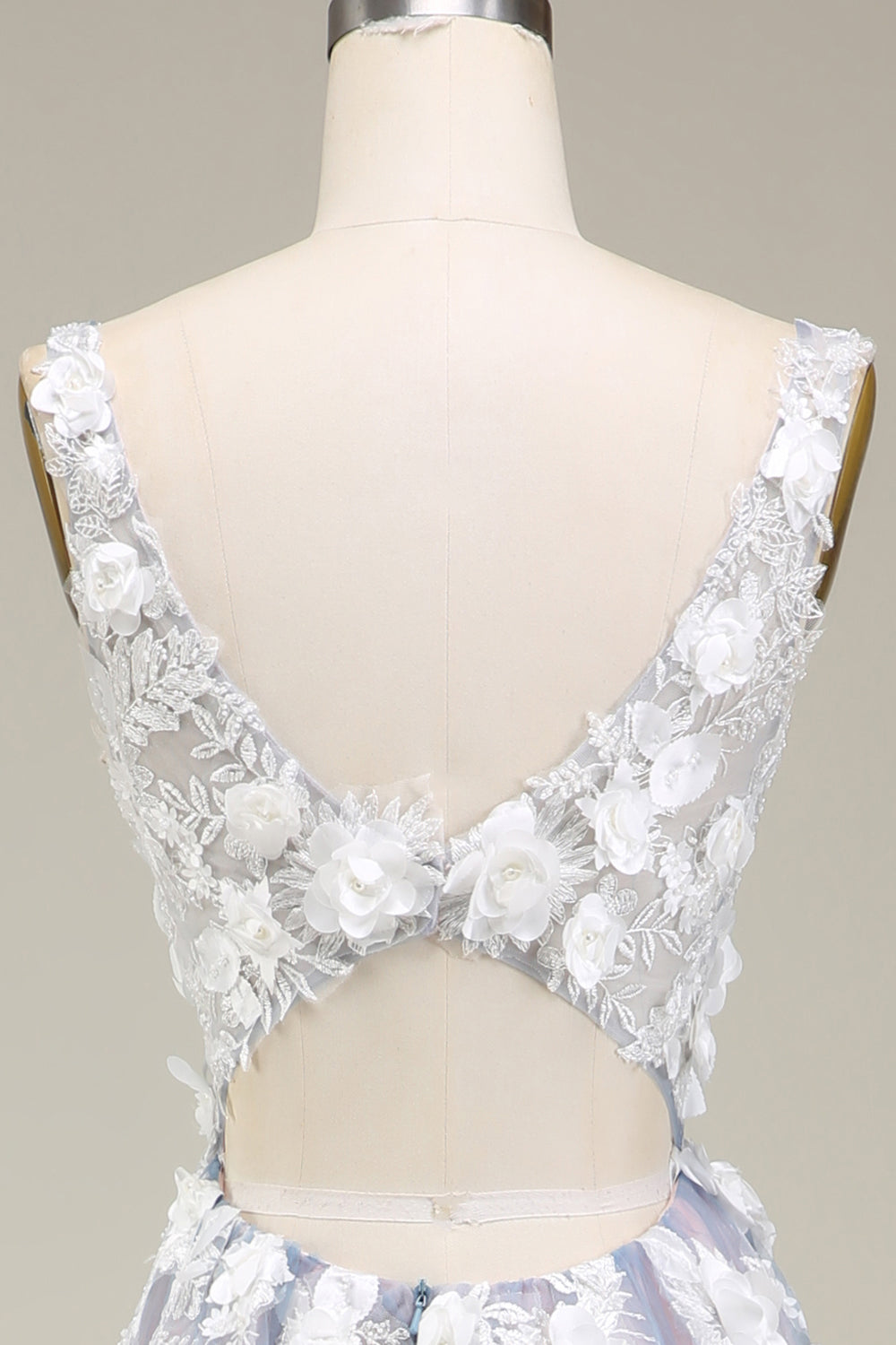 Underbar A Line Djup V-ringning Grå Rosa Lång Balklänning med Applikationsbroderi