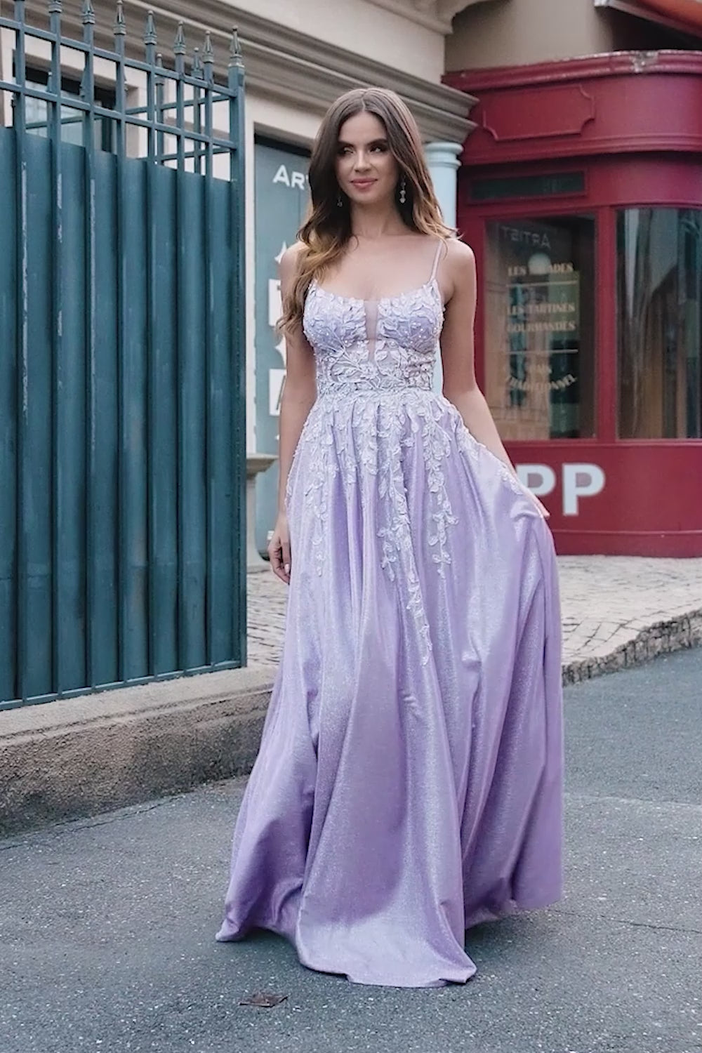 Lila A-linje Spaghetti Straps Lång Glitter Balklänning Med Pärlor