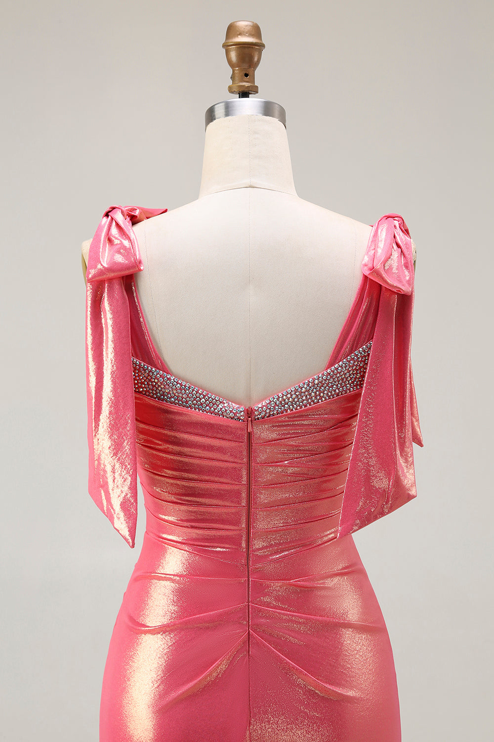Metallisk Korall pärlstav Sjöjungfru rynkad lång balklänning med slits