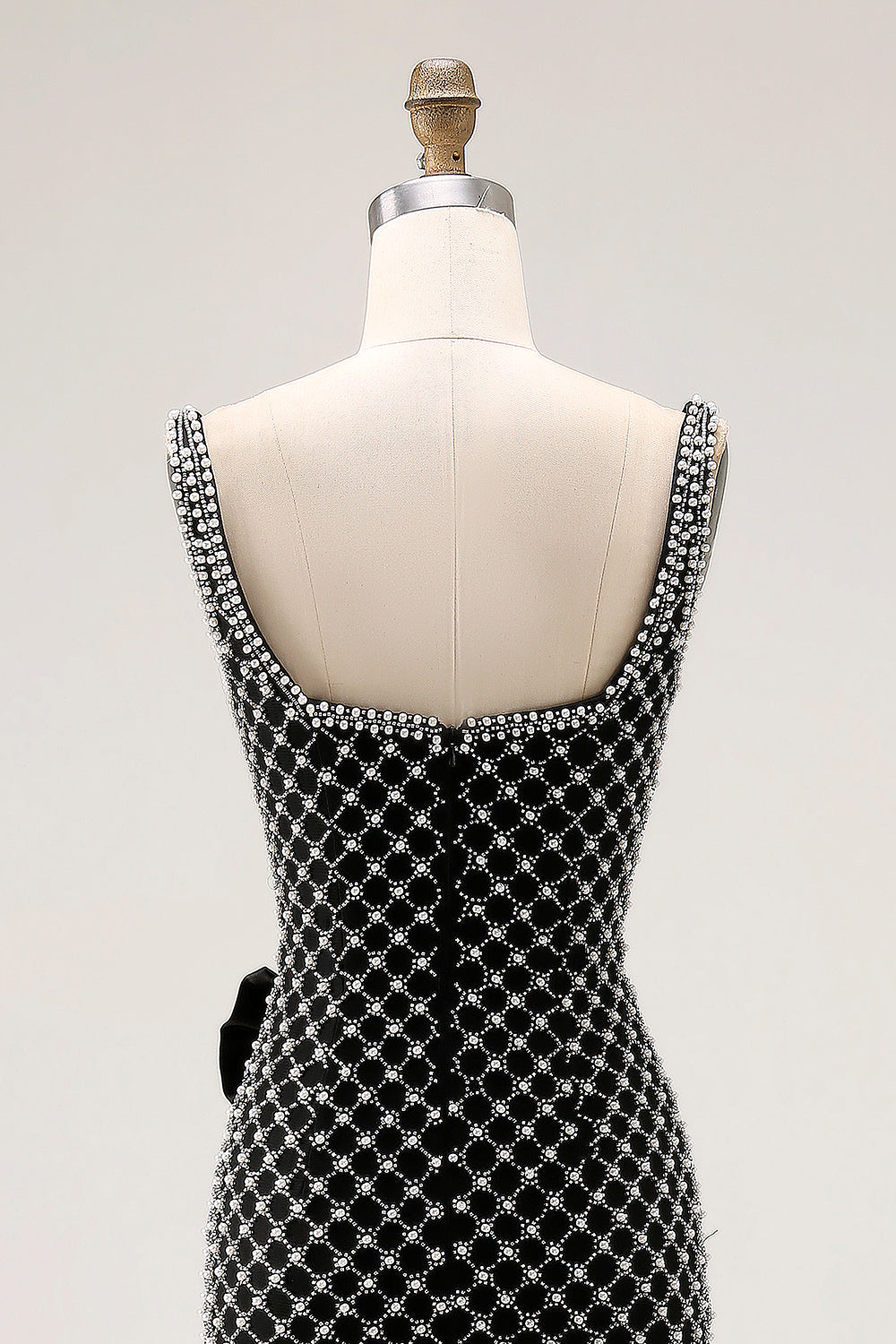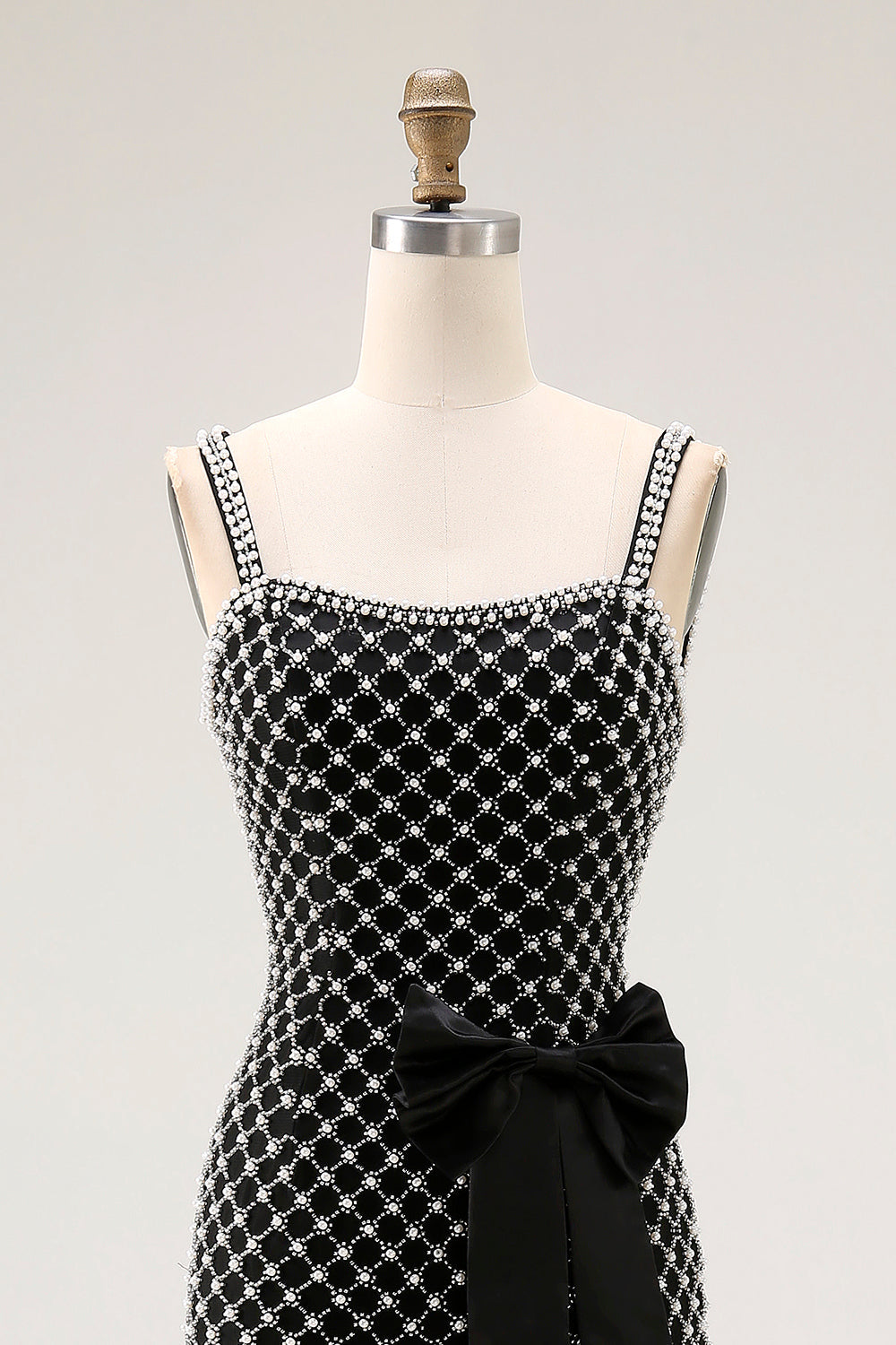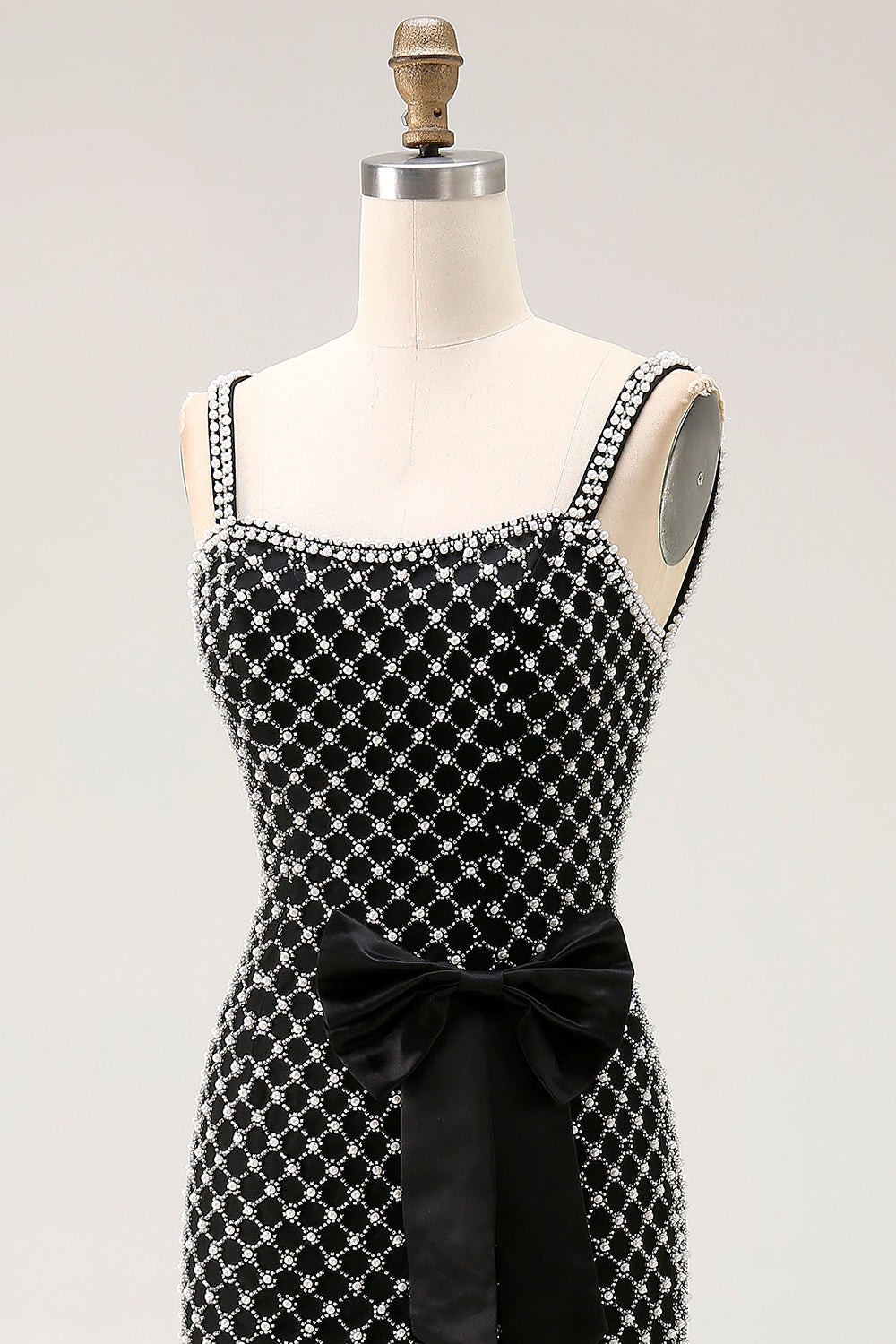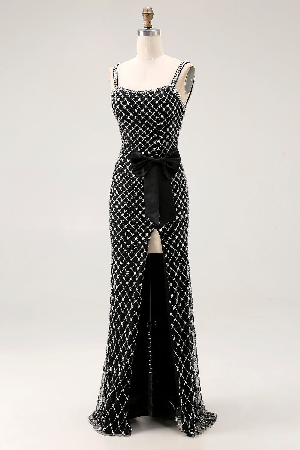Svart pärlstav Sjöjungfru Spaghetti Straps Strass Sida Rosett Lång Bal Klänning Med Slits