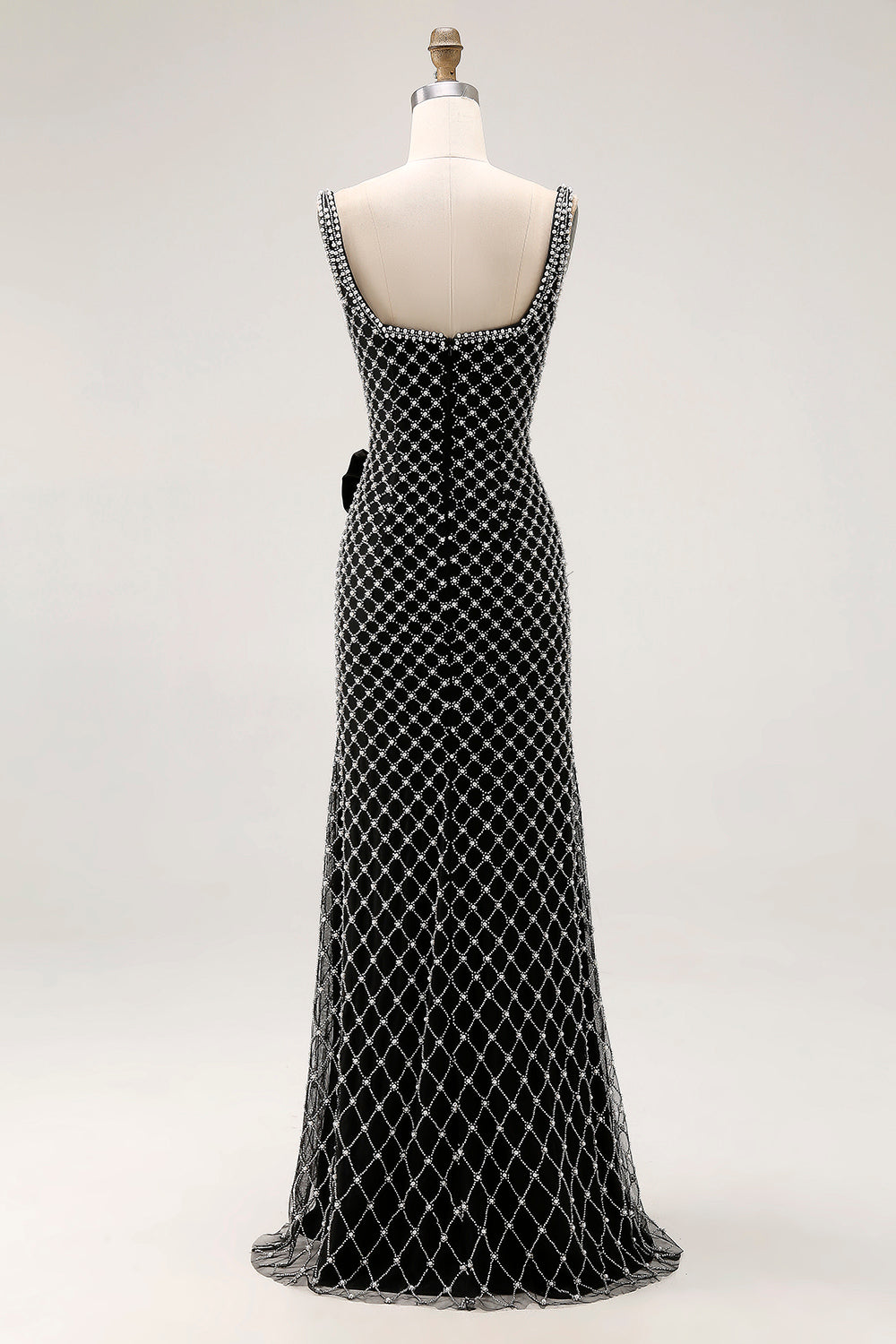 Svart Sjöjungfru Pärlprydd Spaghettiband Spets Stolsrosett Lång Balklänning med Slits