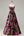 Svart enaxlad mantel med röd blommig lång balklänning med flödande släp och släp.