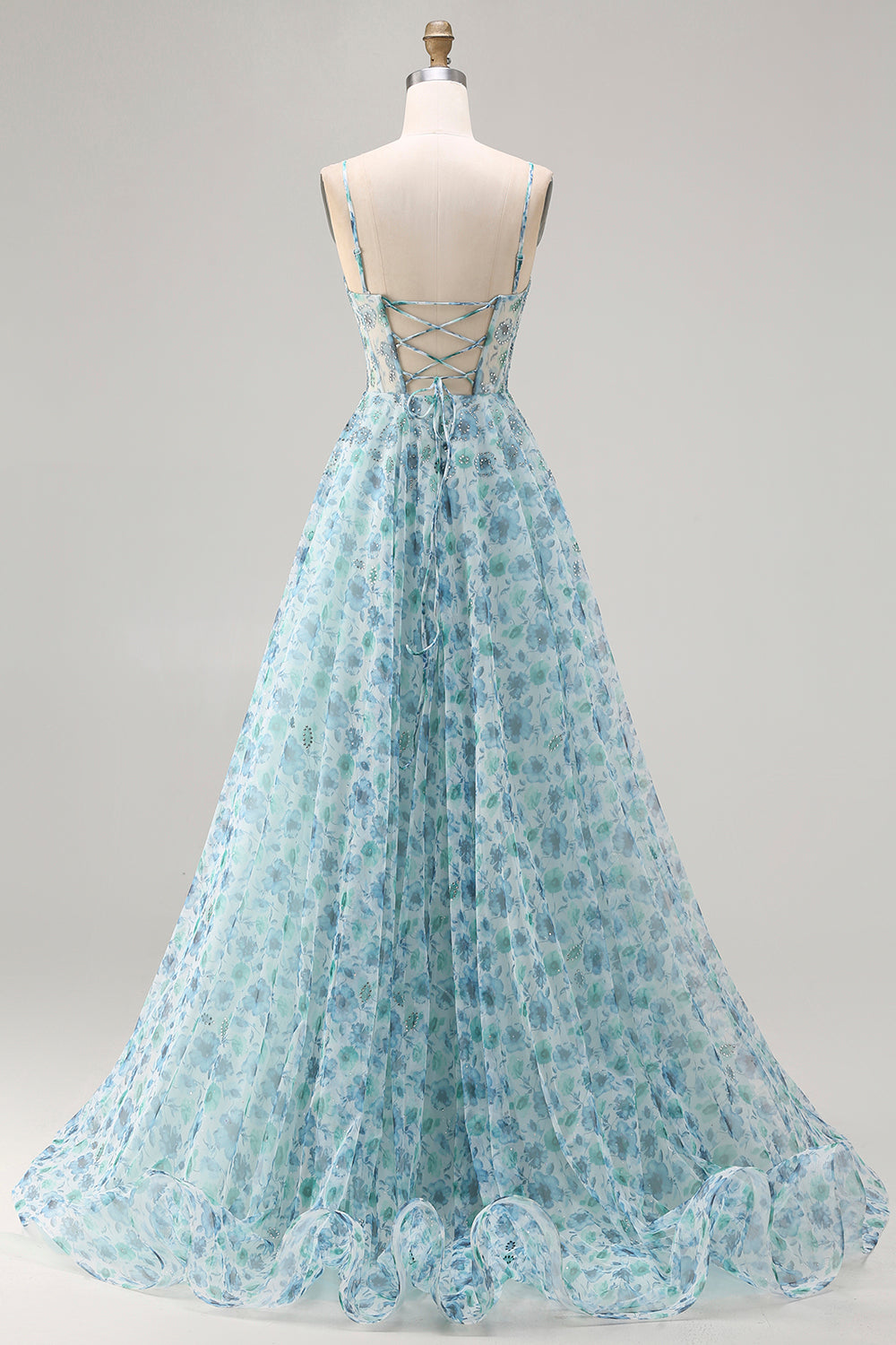 Axelbandslös blå blommig A-linje pärlprydd lång balklänning med slits