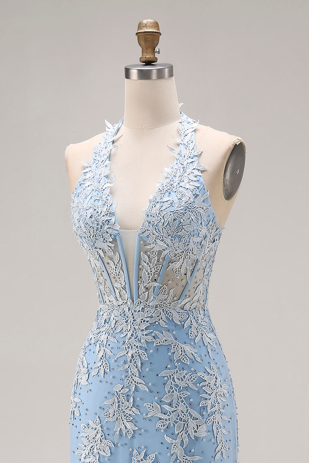 Himmelsblå halter sjöjungfru pärlkorsett Applikique lång balklänning med slits