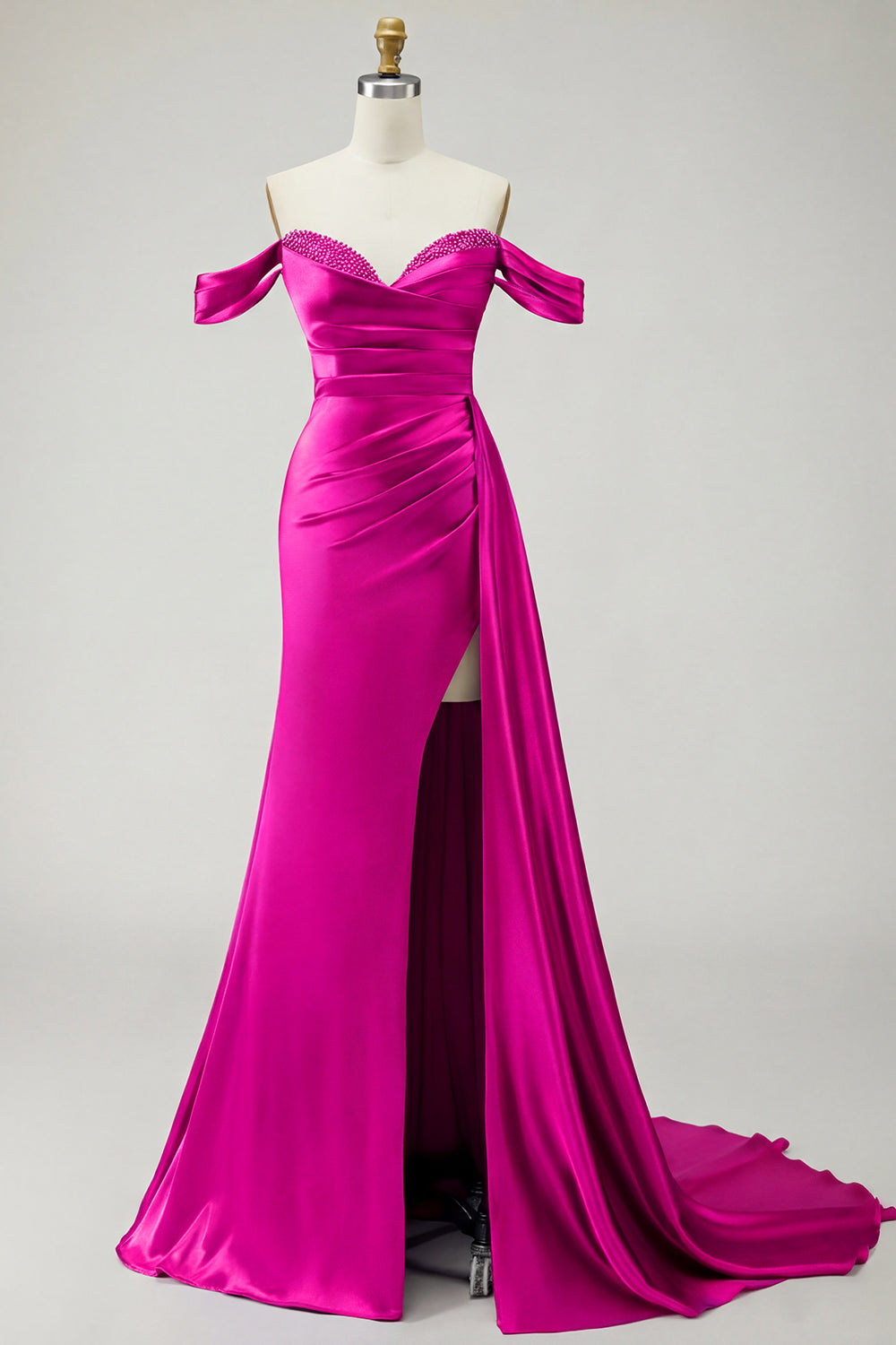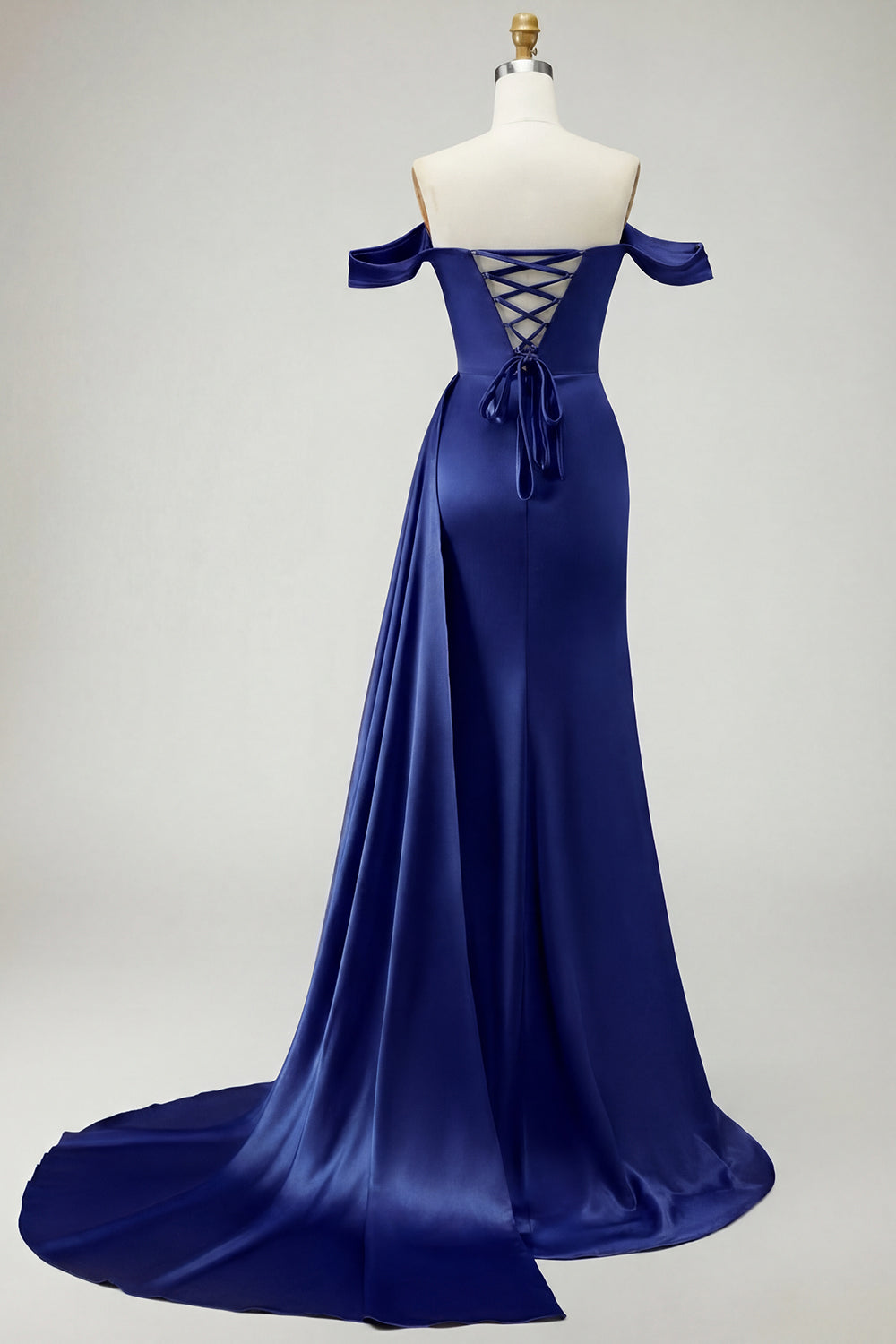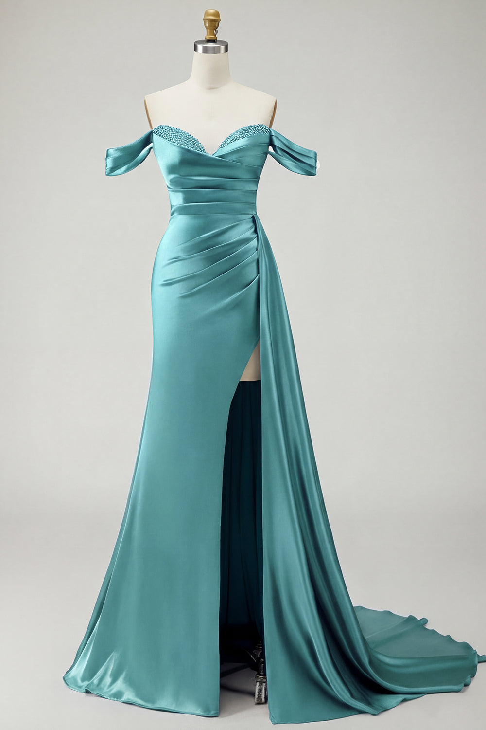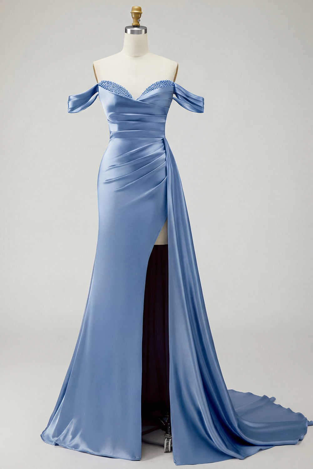 Kungligt blå axelbandslös sjöjungfruklänning med pärlpärlprydd satin lång balklänning med slits