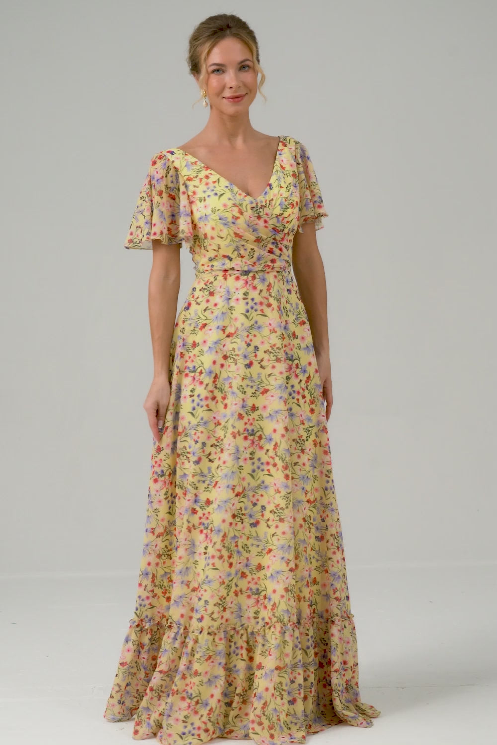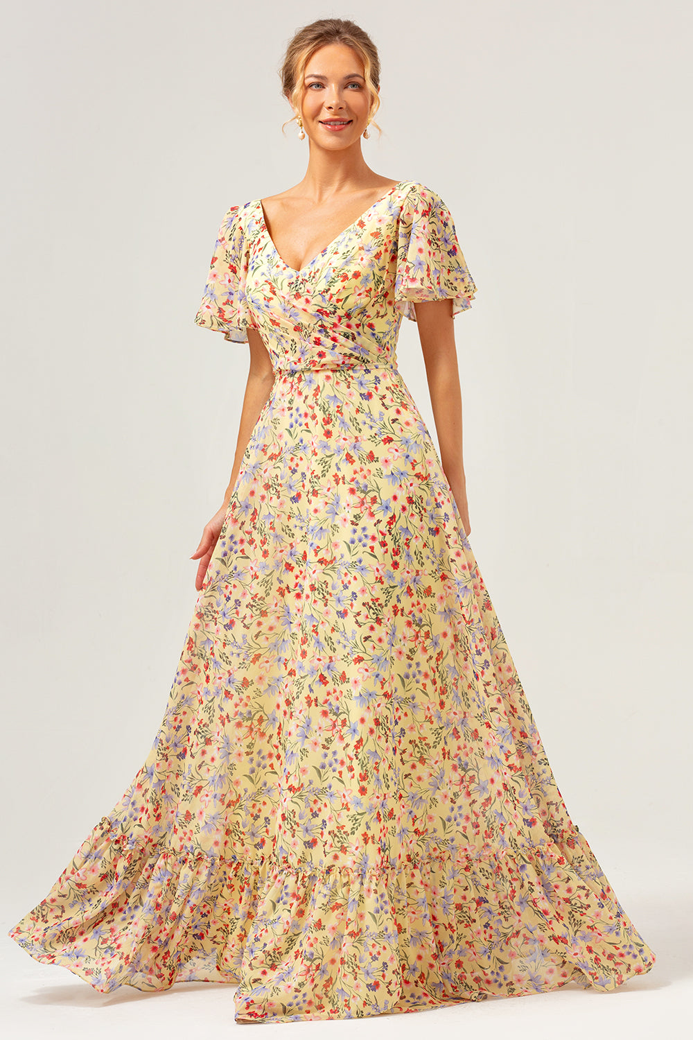 Gul Blomma Tryckt A-linje V-ringning Korta ärmar Lång Balklänning