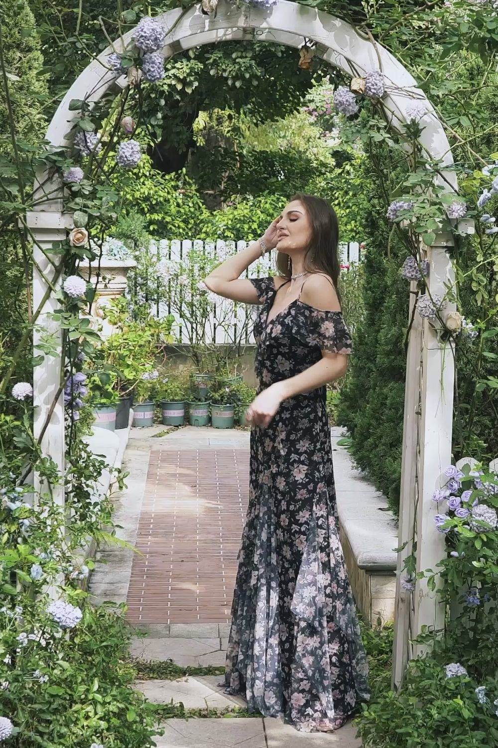 Svart Chiffong Off Shoulder Bal Klänning med blommig