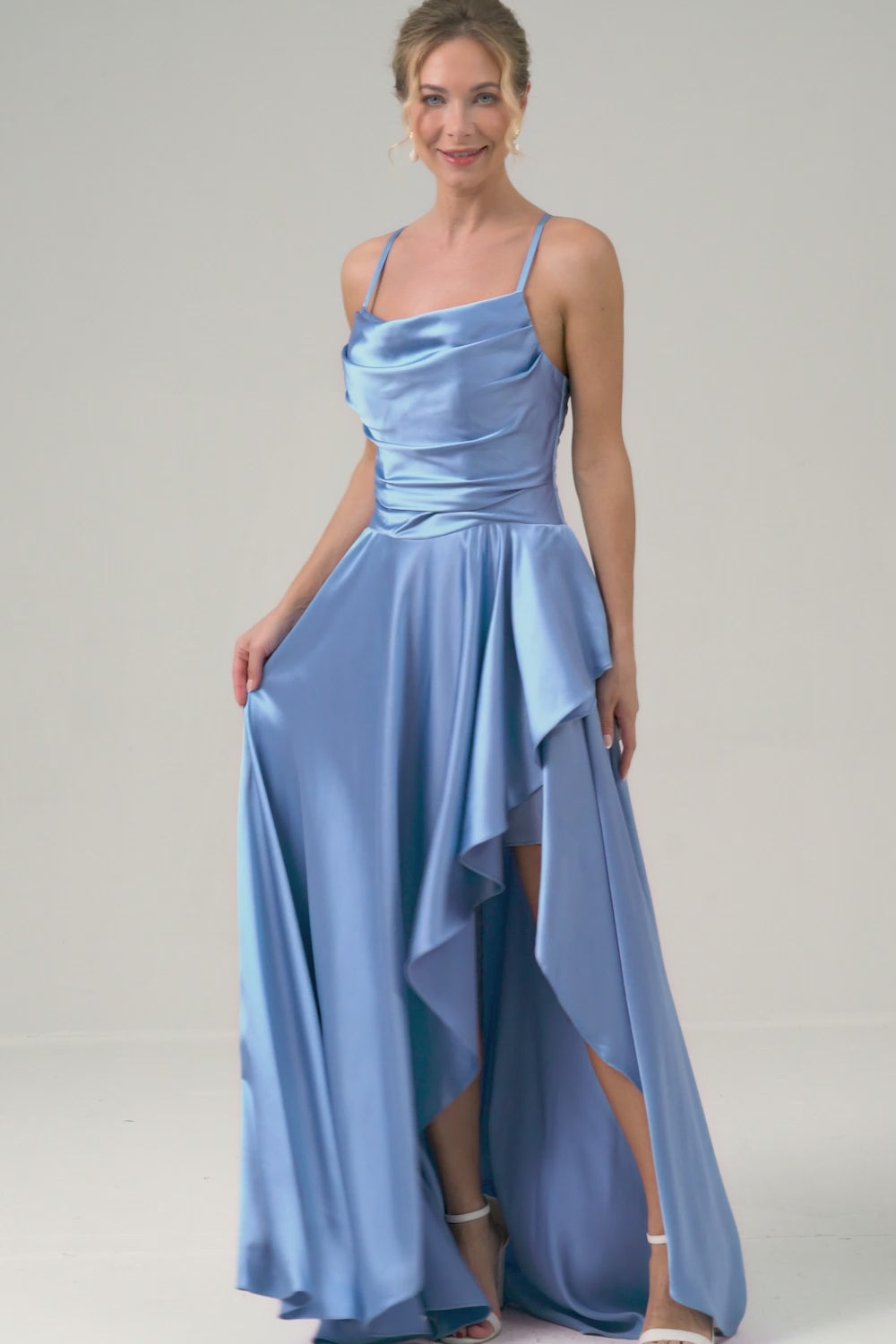 Blå Cowl Neck Satin Asymmetrisk Brudtärna Klänning med Slits