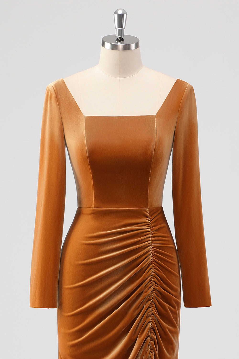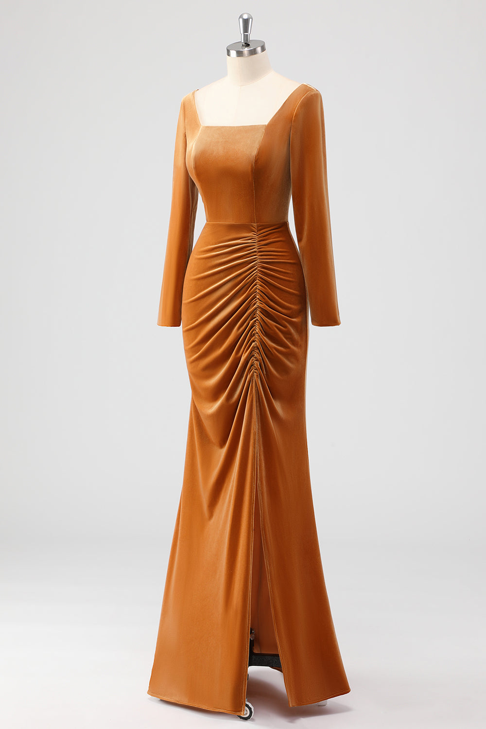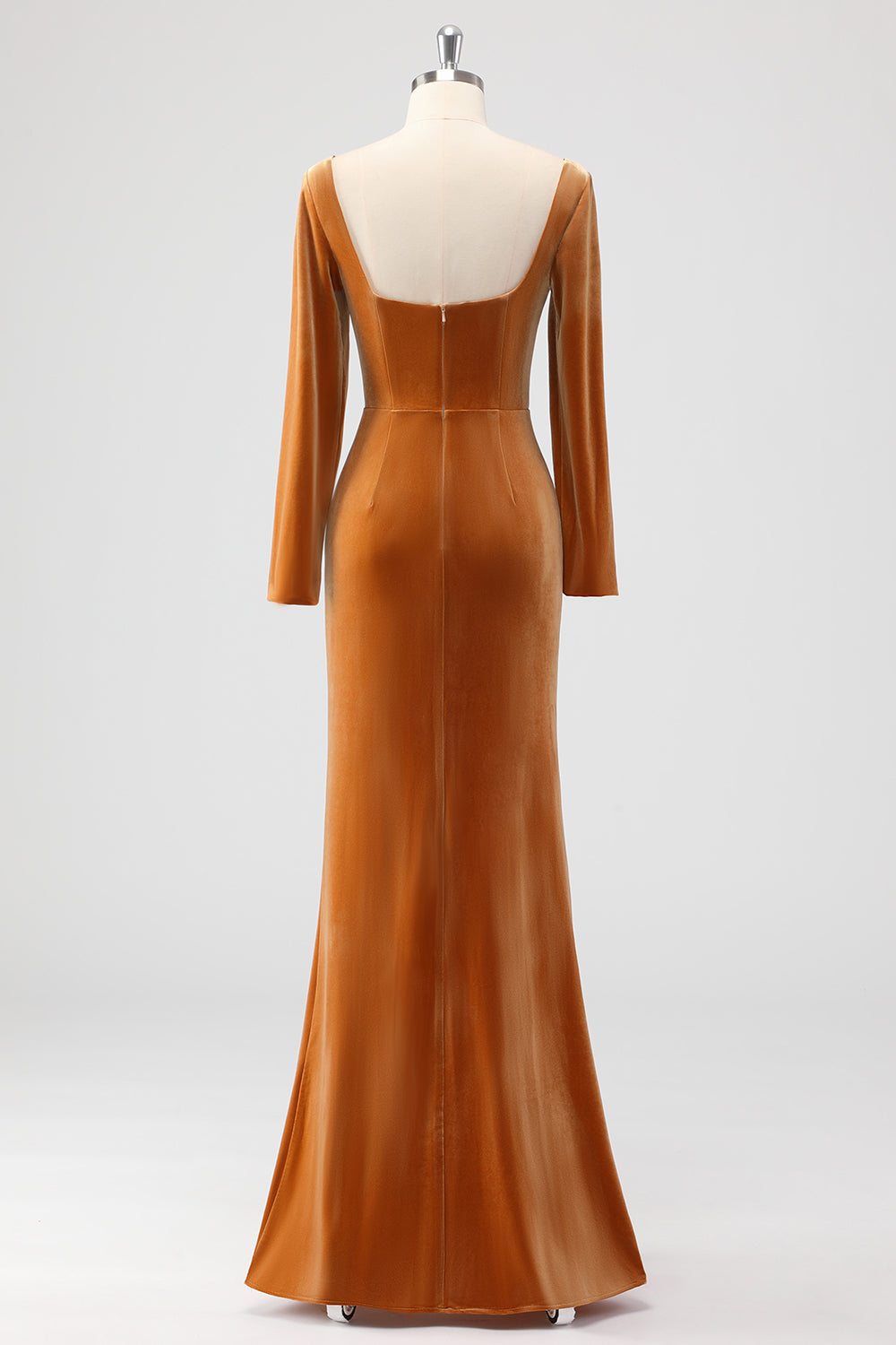 Brun Slida Fyrkantig hals Sammet Långärmad Lång Brudtärna Klänning