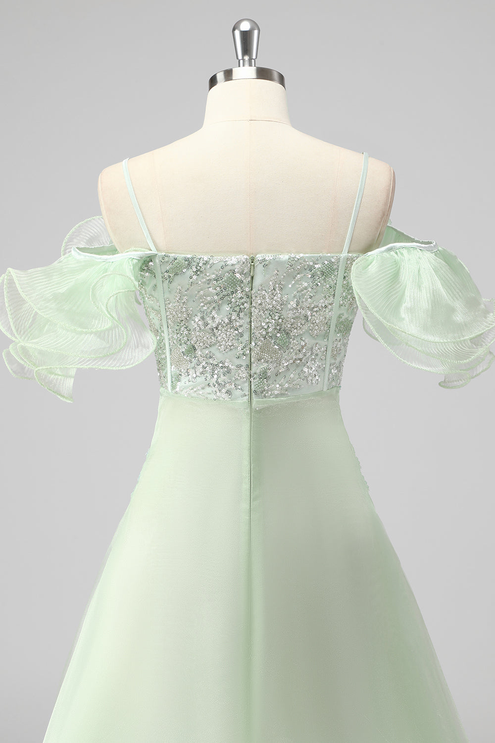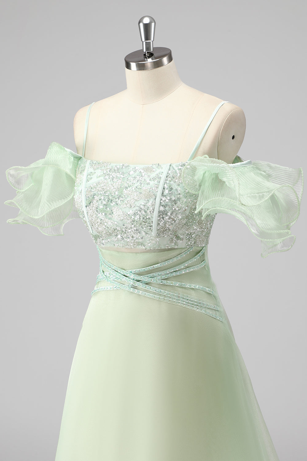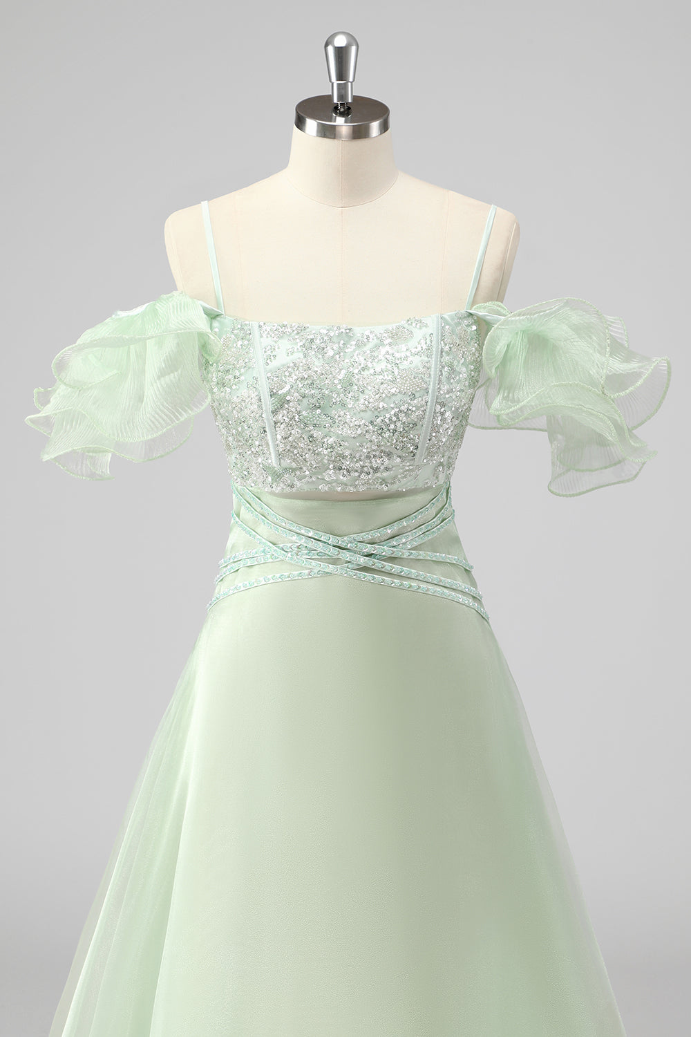 En linje ljusgrön från axeln paljetter bröllop gäst klänning