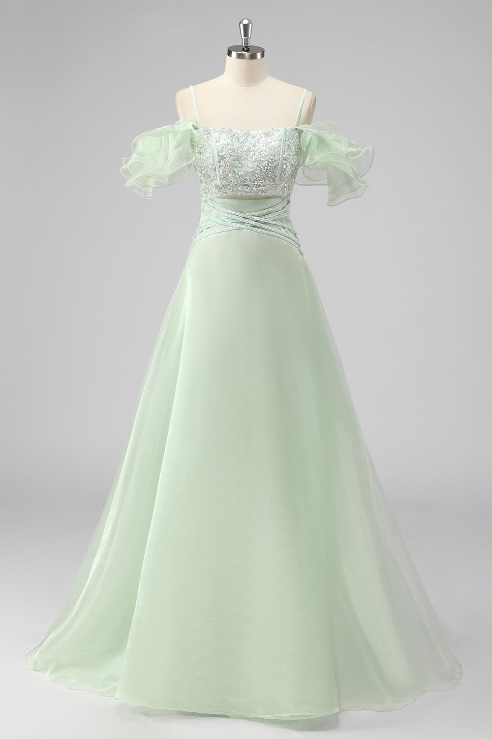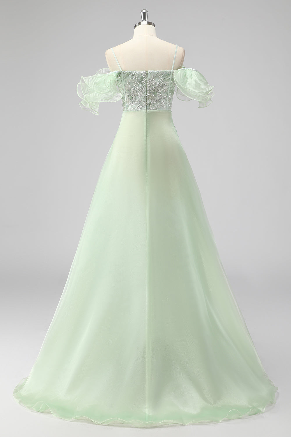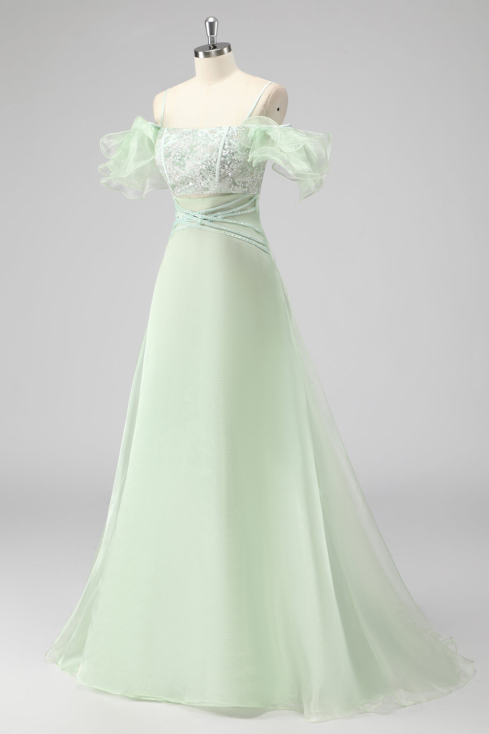 En linje ljusgrön från axeln paljetter bröllop gäst klänning