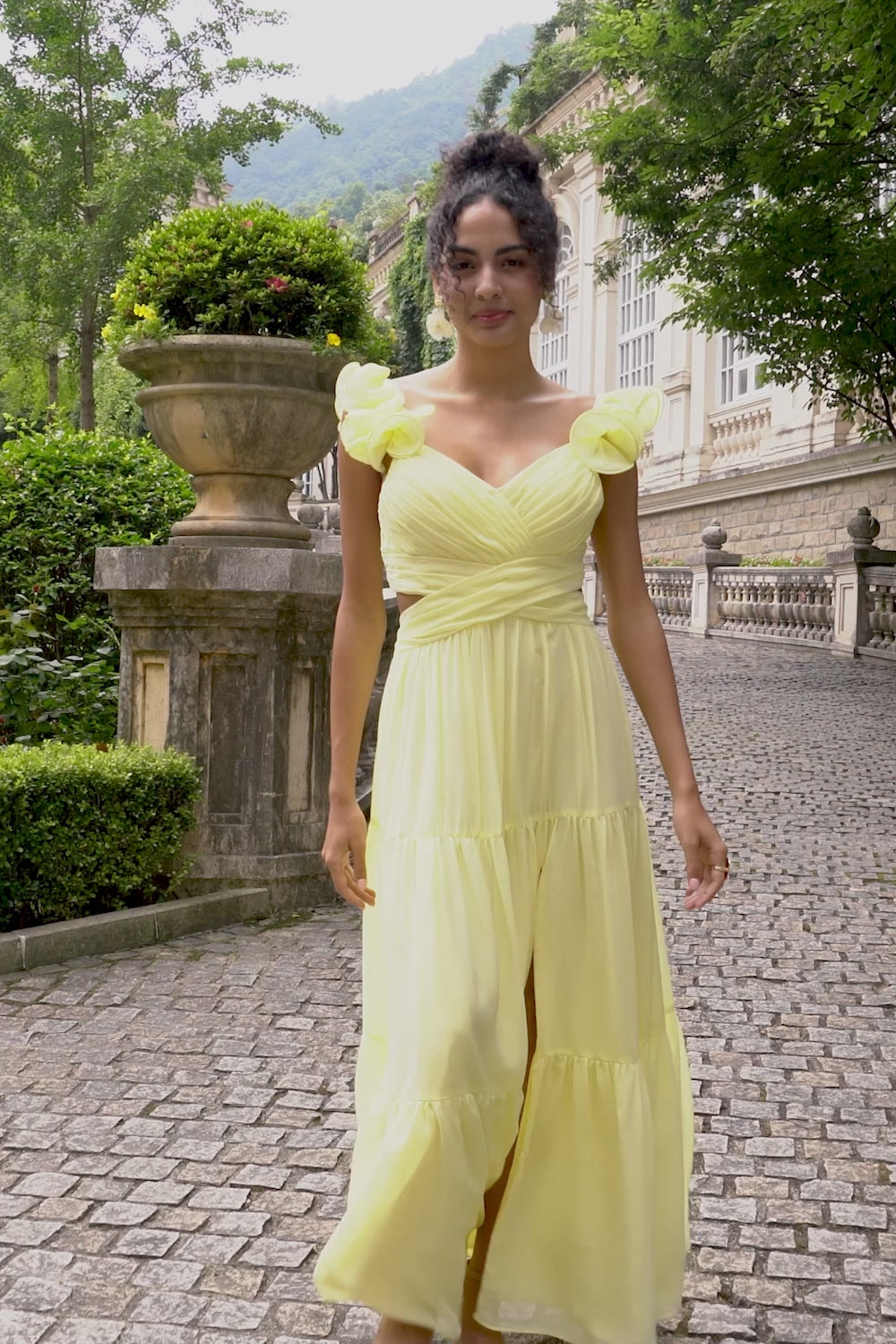 Enkel Citron Gul En linje Plisserad Bröllopsfest Gästklänning med Volanger