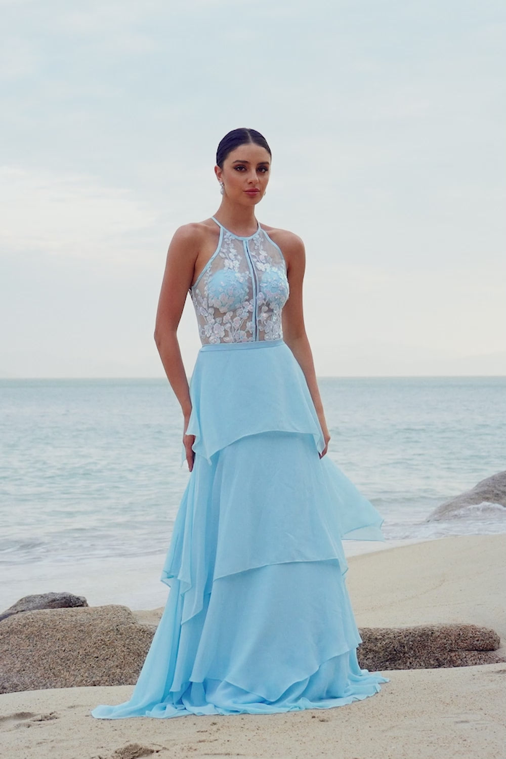 Glittrande Blå Halter Blommig Lång Brudtärna Klänning med Snörning Upp Tillbaka