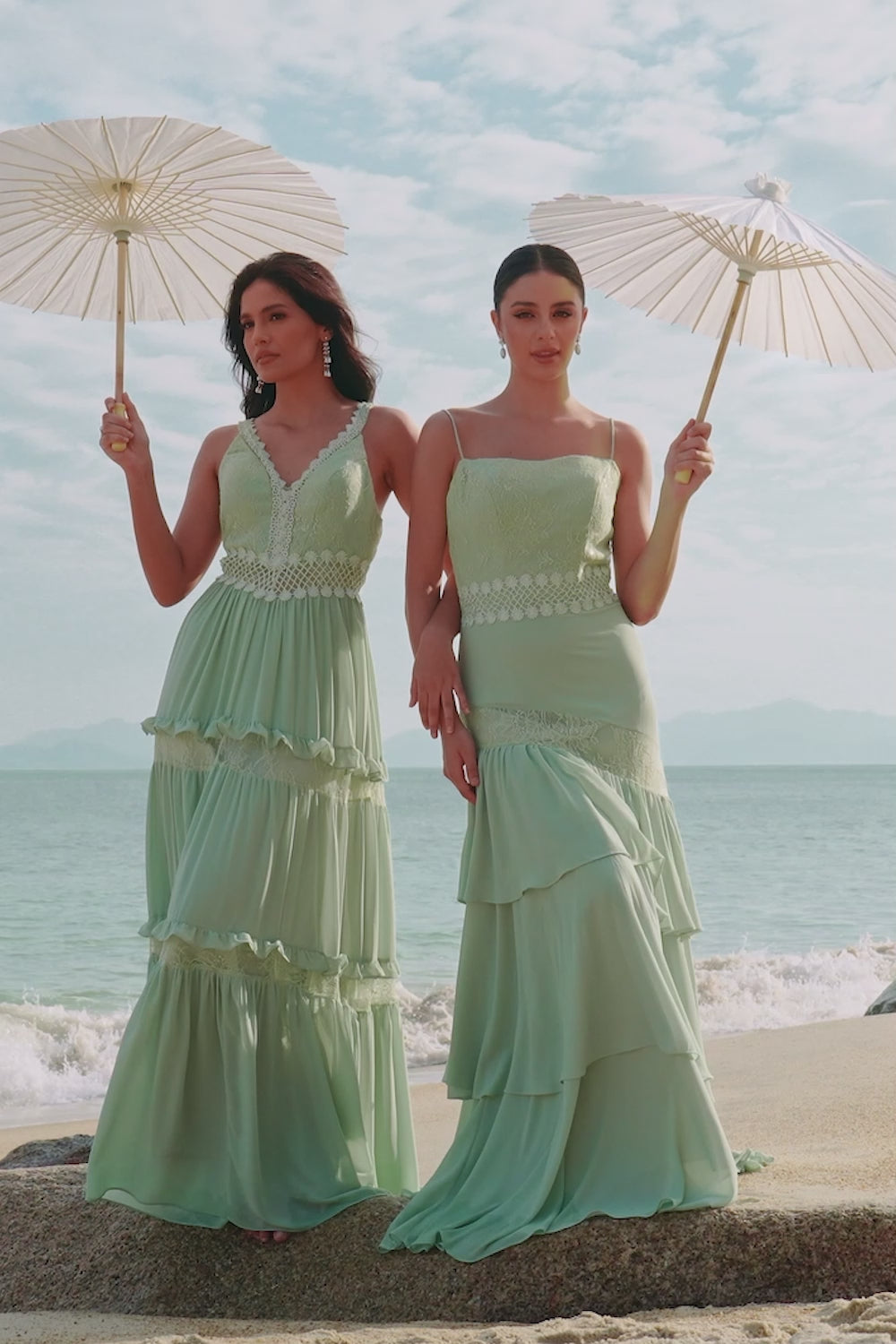 Grön sjöjungfru blommig chiffong lång volang brudtärna klänning med spets