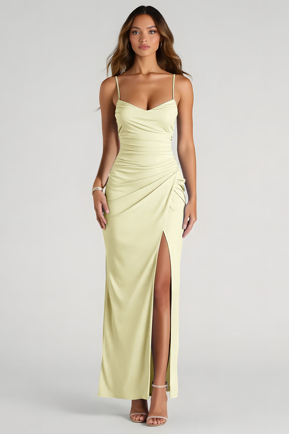 Ljusblå Spaghetti Remmar Slida Rynkad Lång Brudtärna Klänning