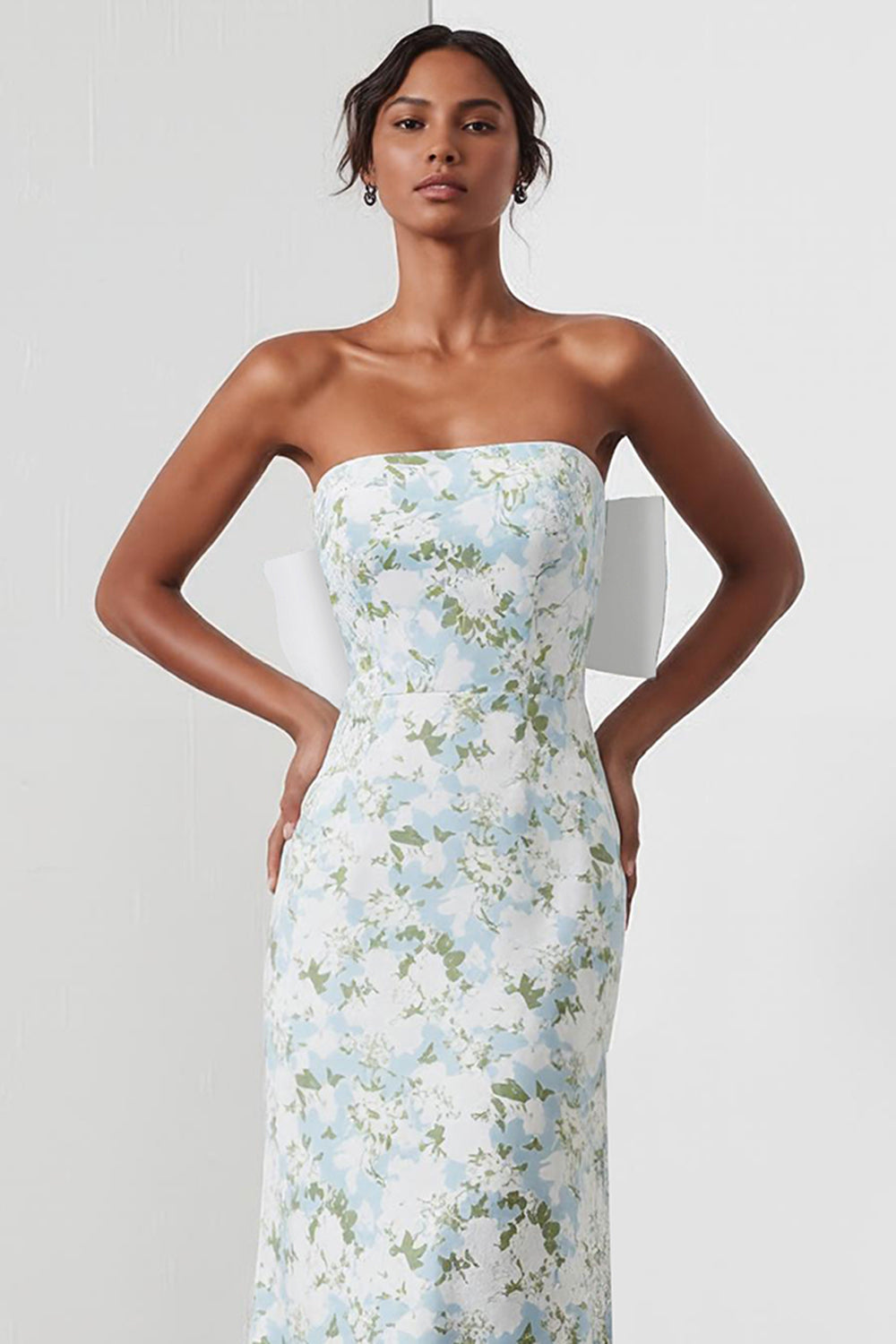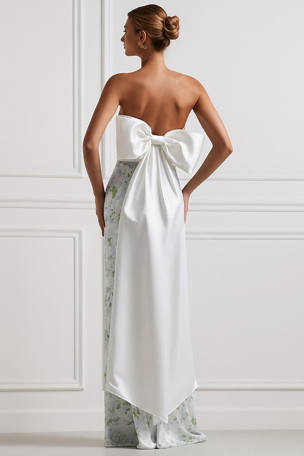 Slida Axelbandslös Blå Vit Blommig Satin Lång Brudtärna Klänning med Rygg Rosett