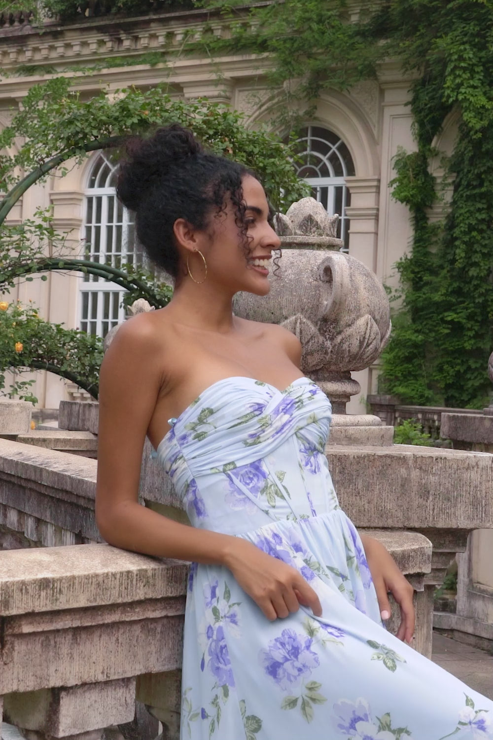 Blå Blommig A Line Älskling Axelbandslös Tryck Plisserad Lång Bröllop Gäst Klänning