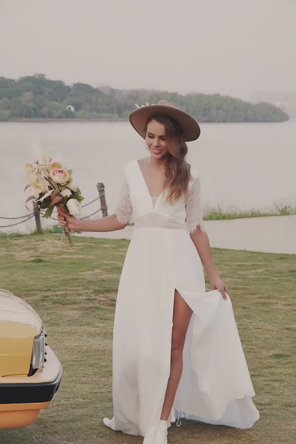 Elfenbens Spets Chiffong Halvärmar Boho Bröllopsklänning Med Slits