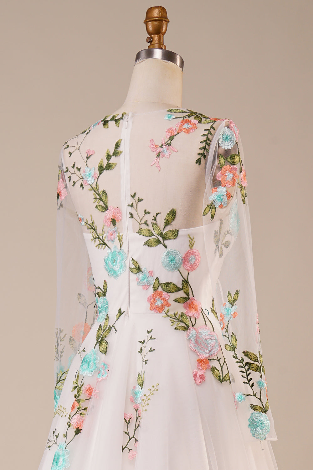 Tyll Långärmad Lång Elfenben Bröllopsklänning med Broderi