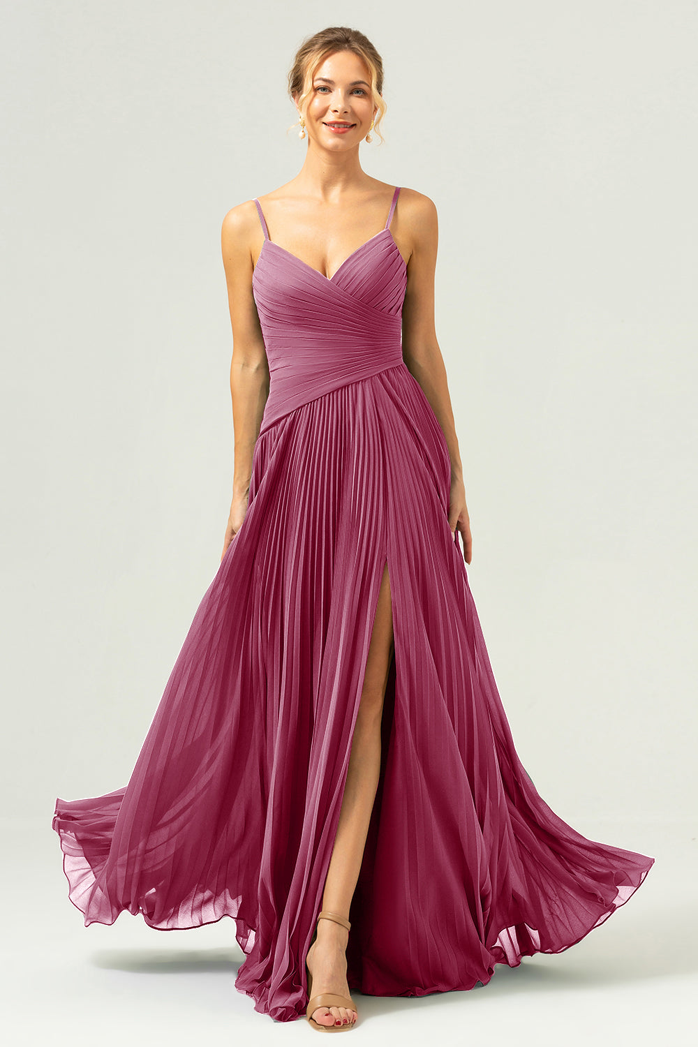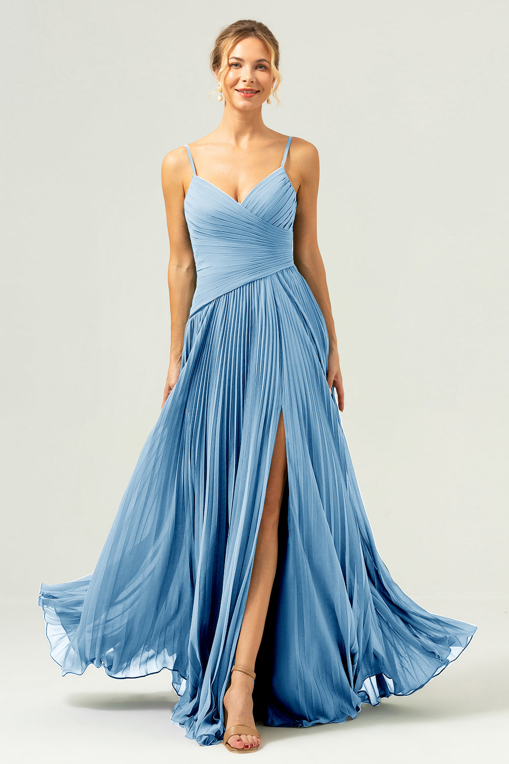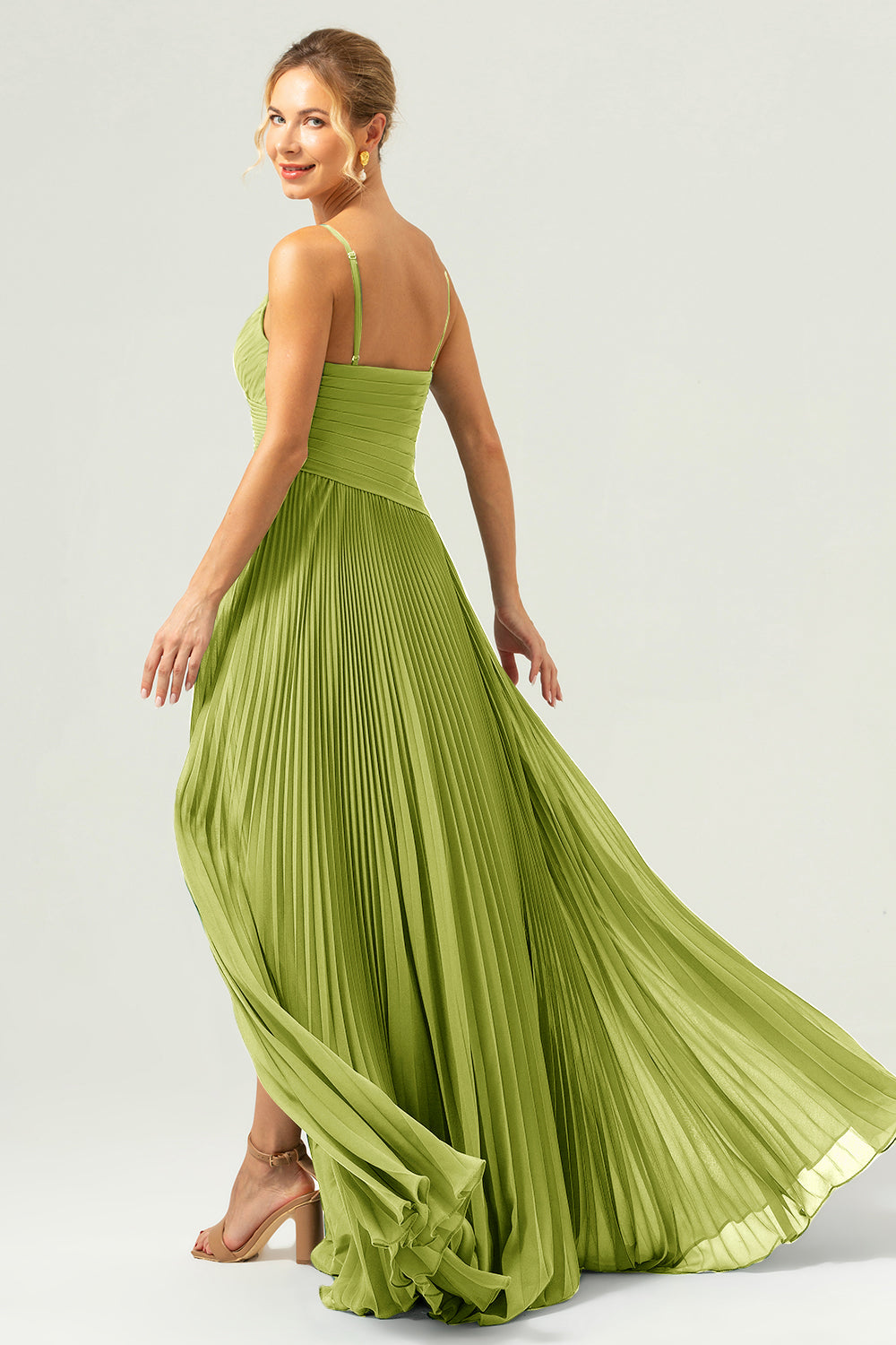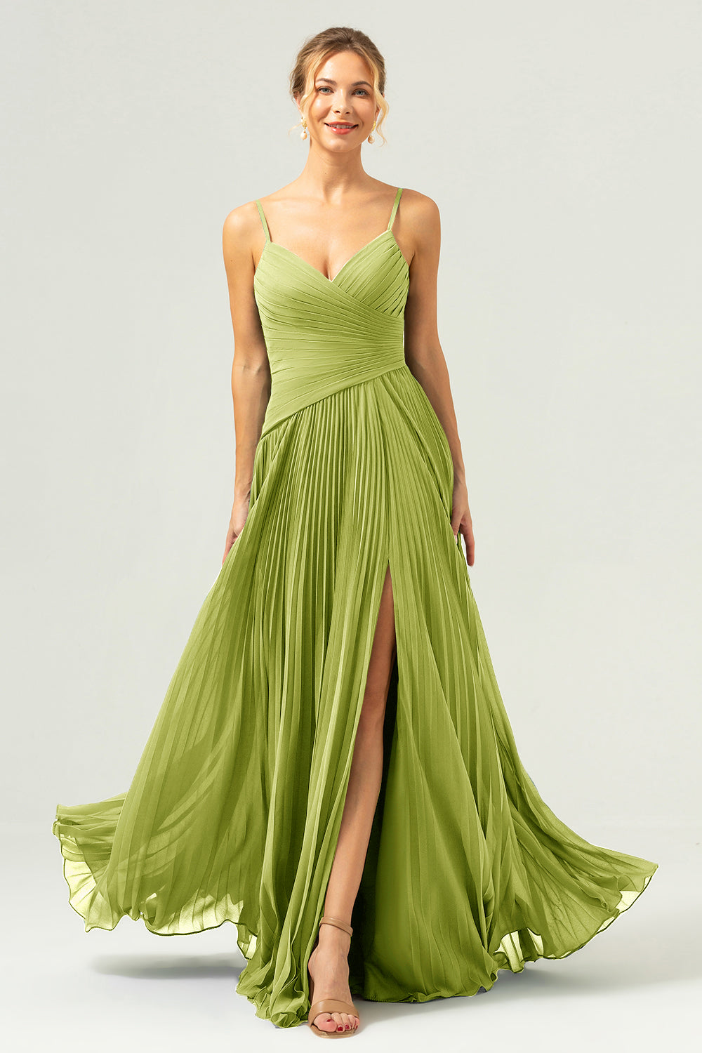 A-linje Spaghetti Remmar Plisserad Chiffong Eucalyptus Brudtärna Klänning med Slits