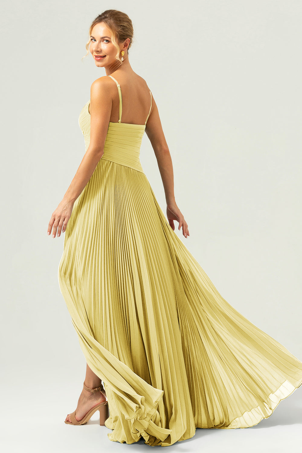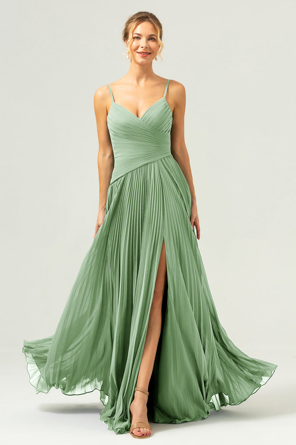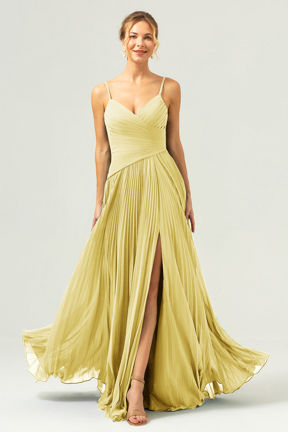 A-linje Spaghetti Remmar Plisserad Chiffong Påsklilja Brudtärna Klänning med Slits