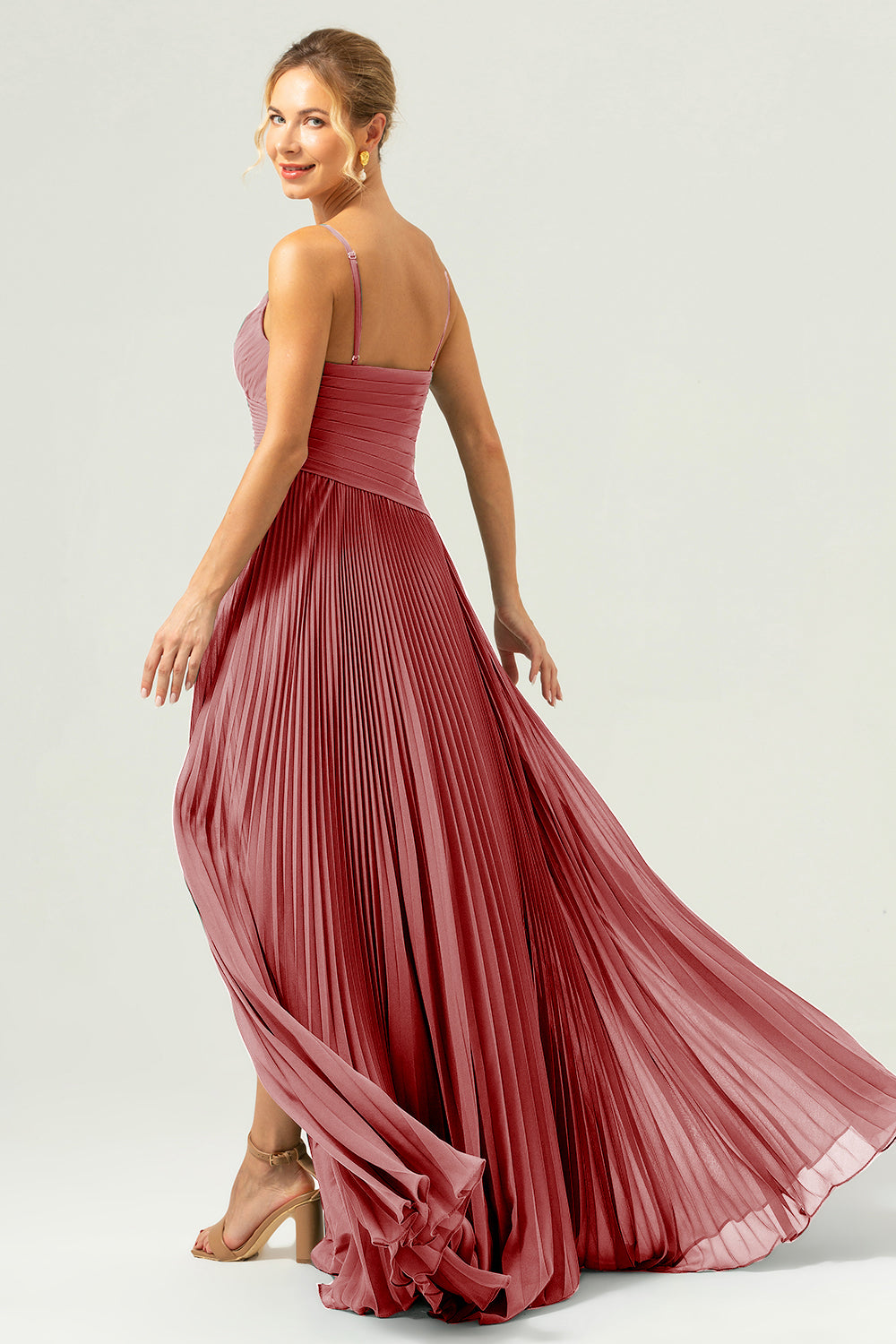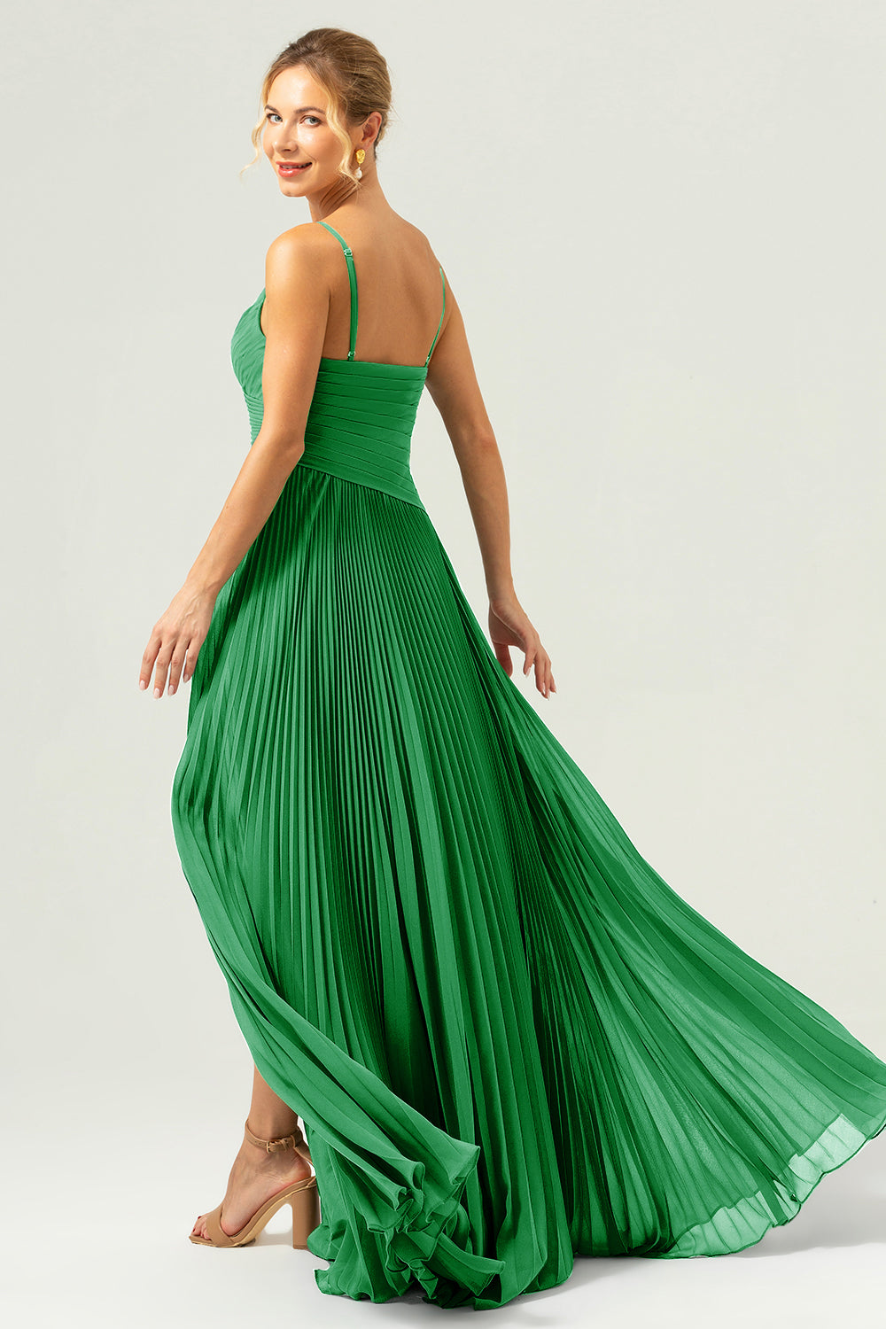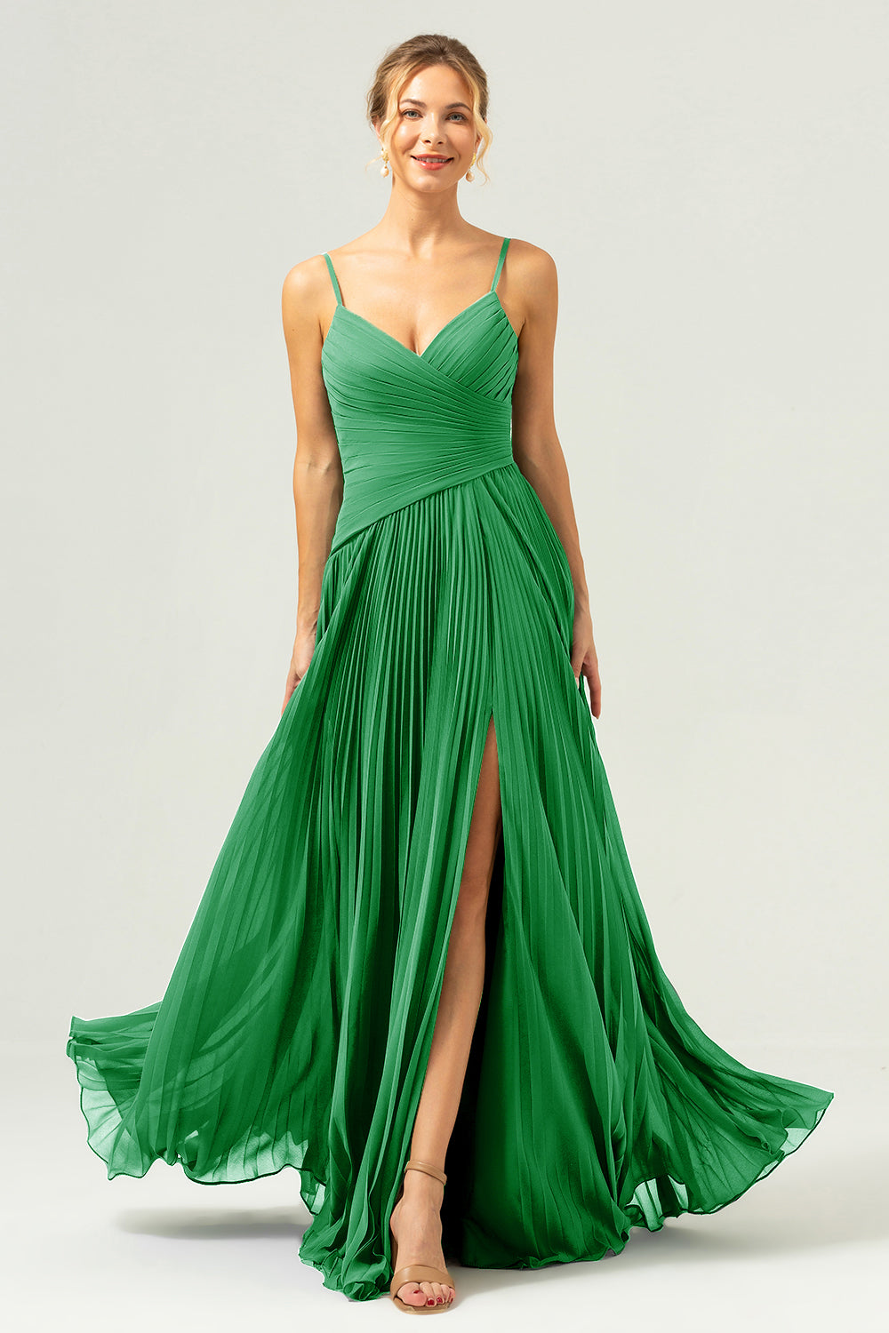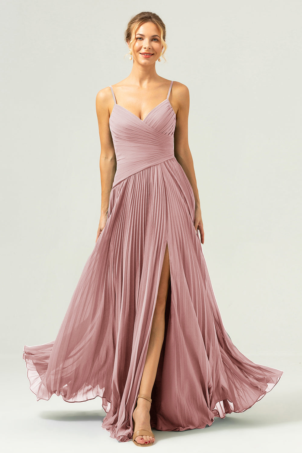 A-linje Spaghetti Remmar Plisserad Chiffong Påsklilja Brudtärna Klänning med Slits