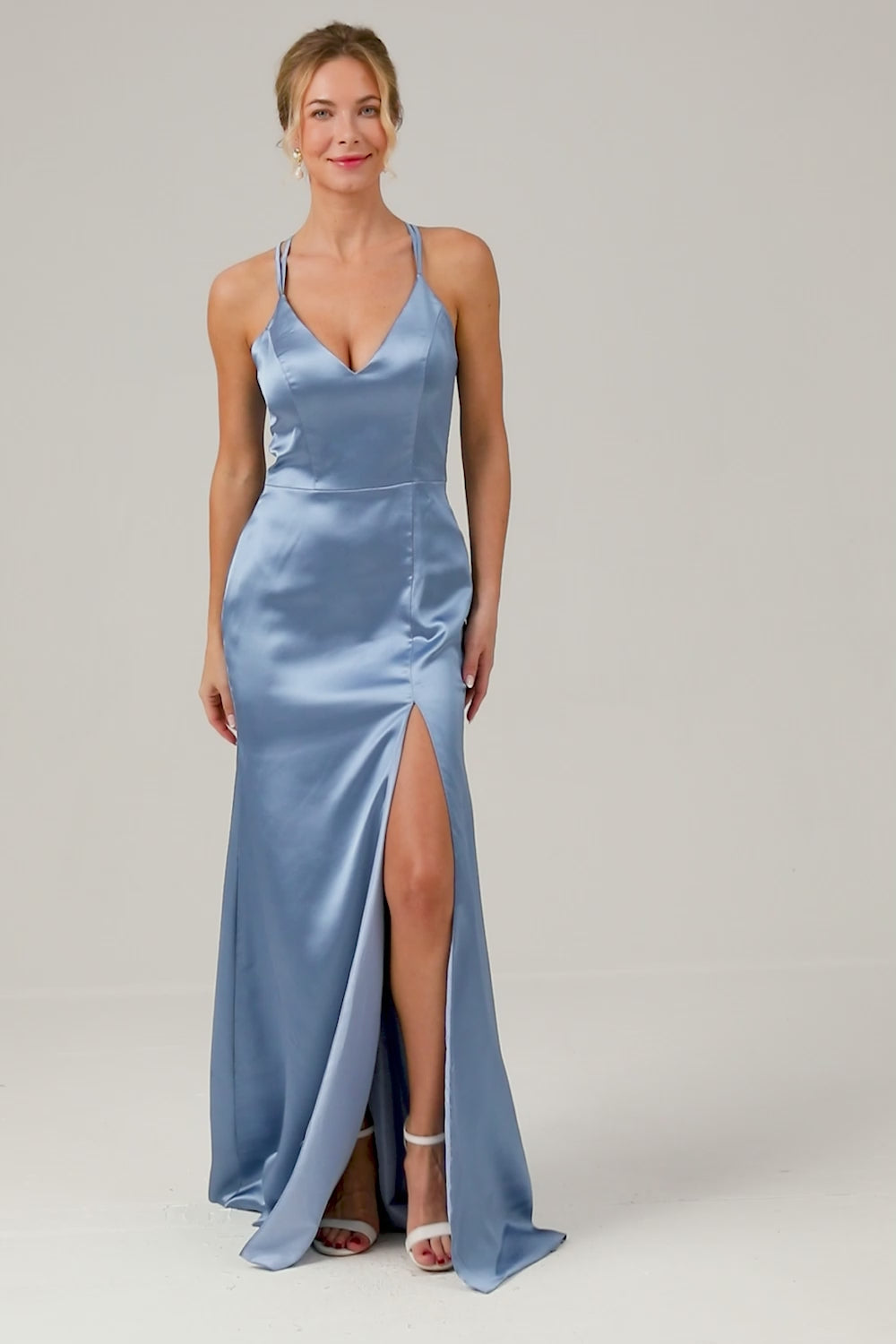 Blå Mermaid Spaghetti Straps Lång Satin Brudtärna Klänning med Slits