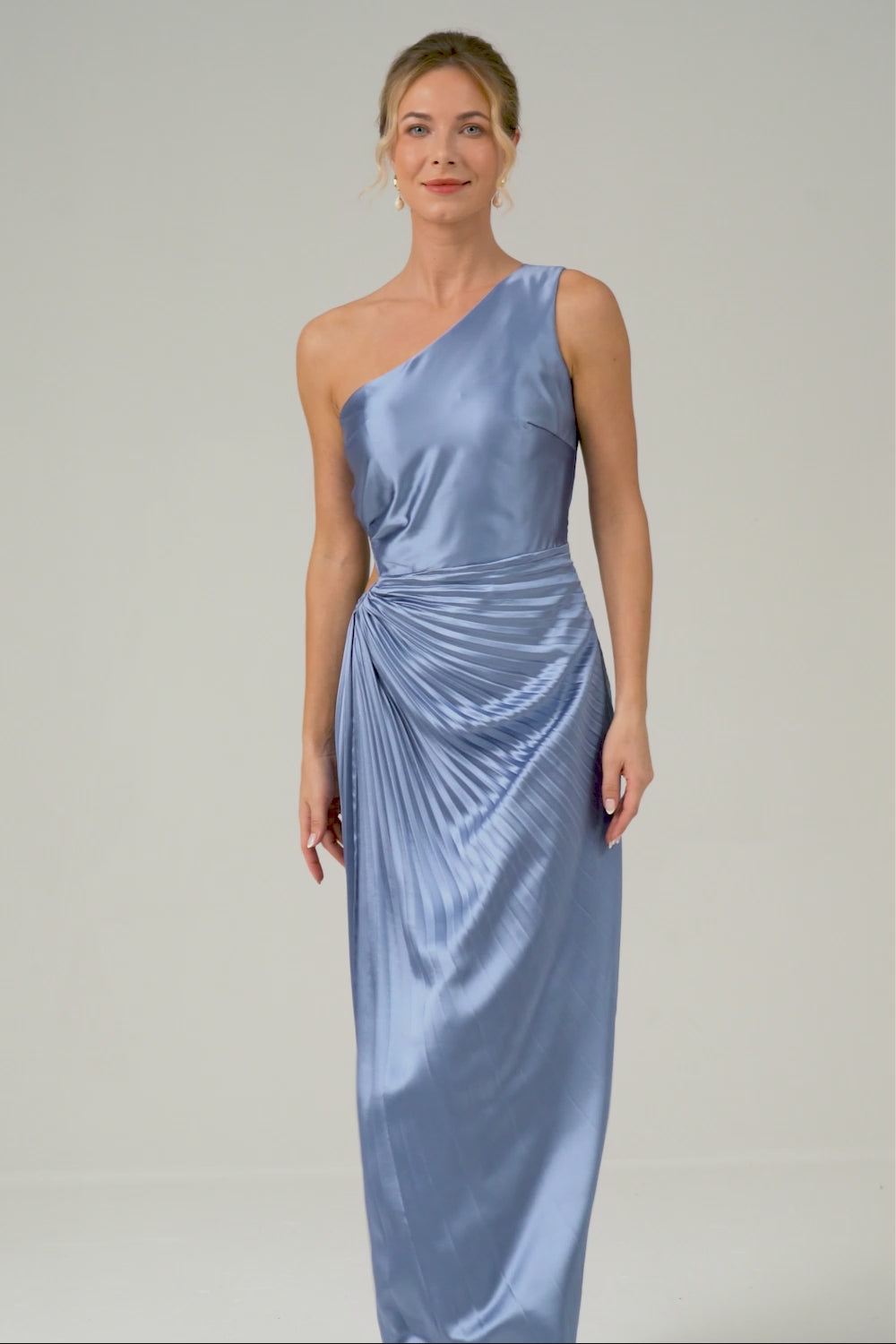 Blå Slida En Axel Satin Nyckelhål Lång Brudtärna Klänning