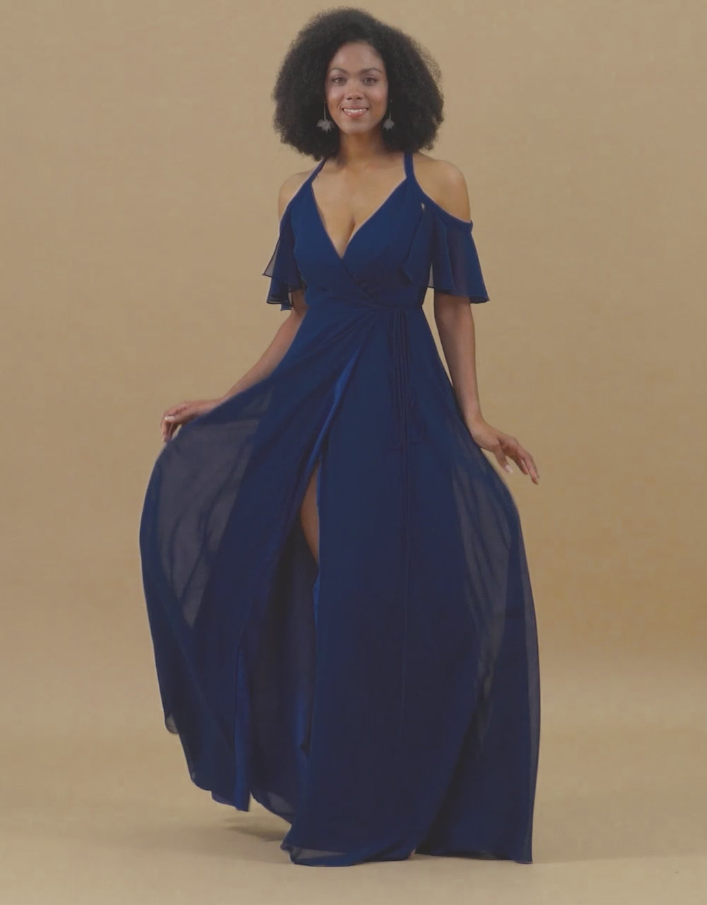 Cold Shoulder Marinblå Chiffong Brudtärneklänning Med Slits
