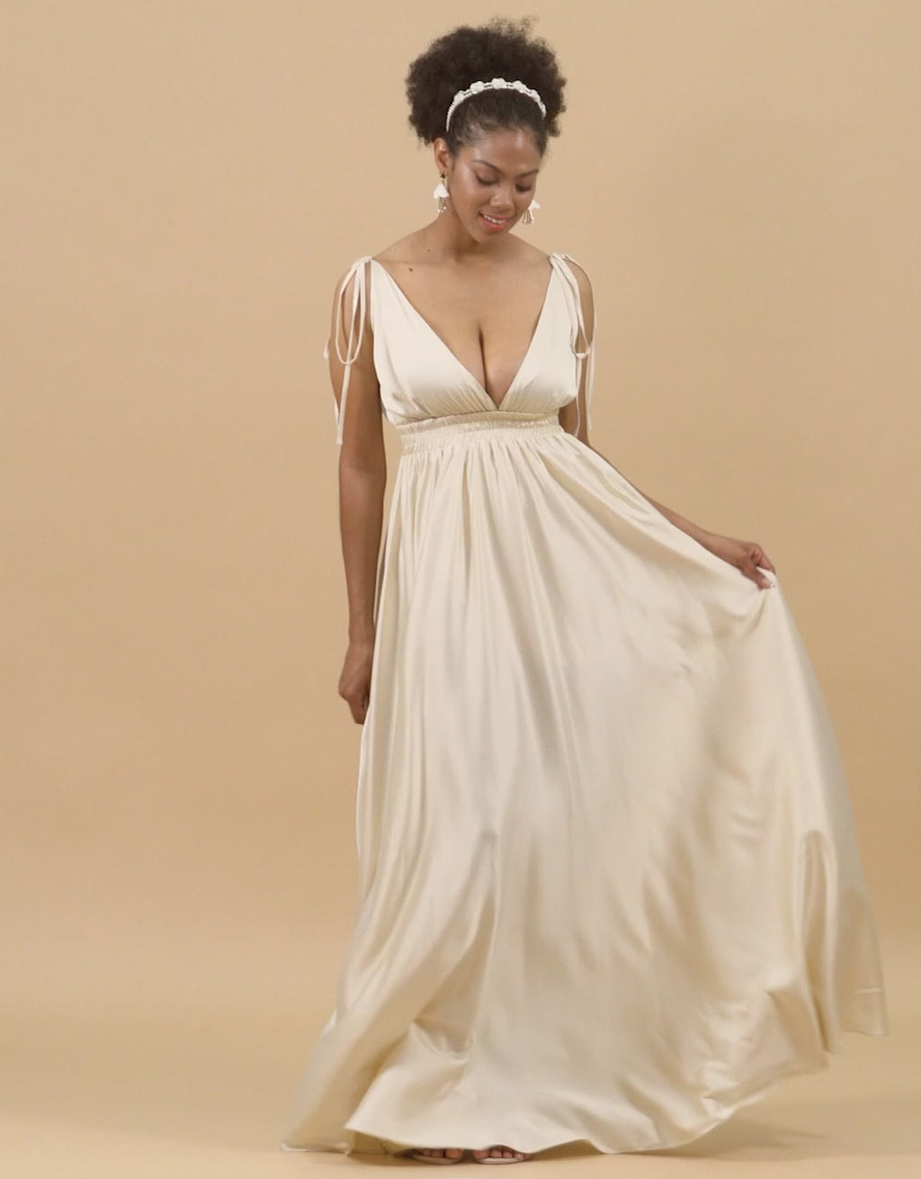 Elfenben djup V-ringad rygglös lång brudtärna klänning