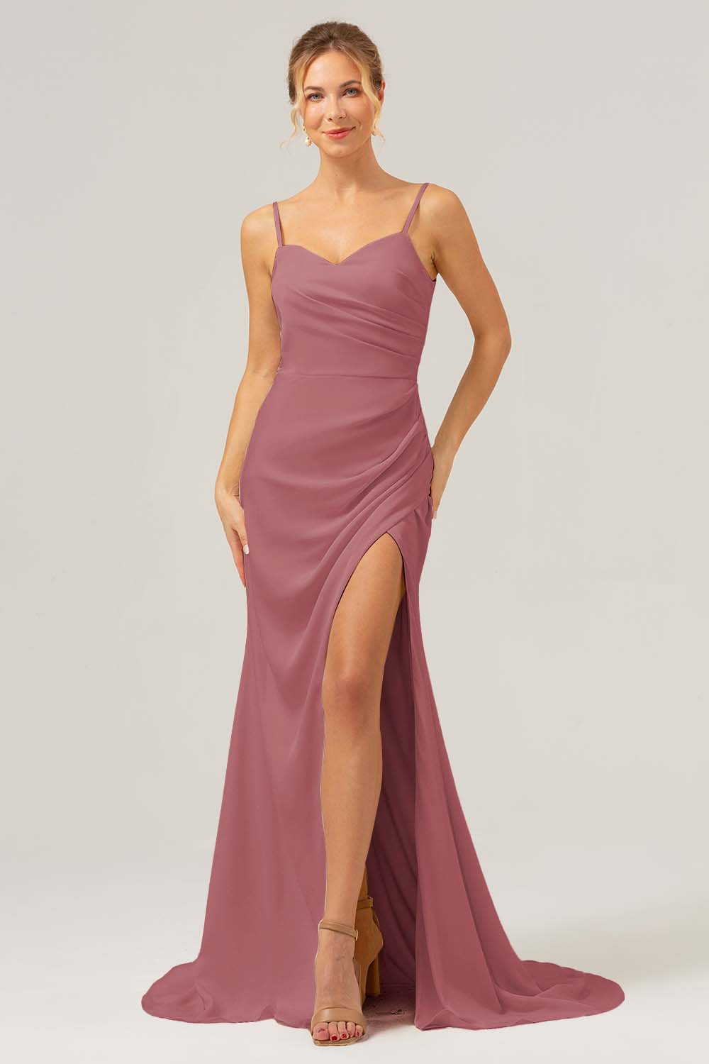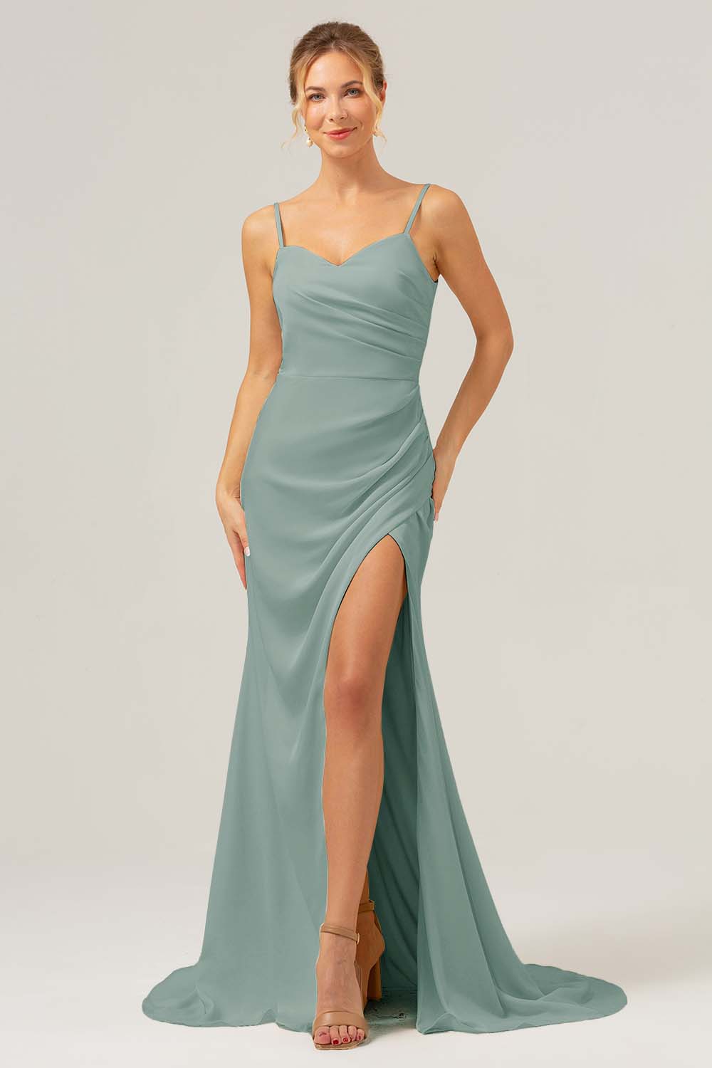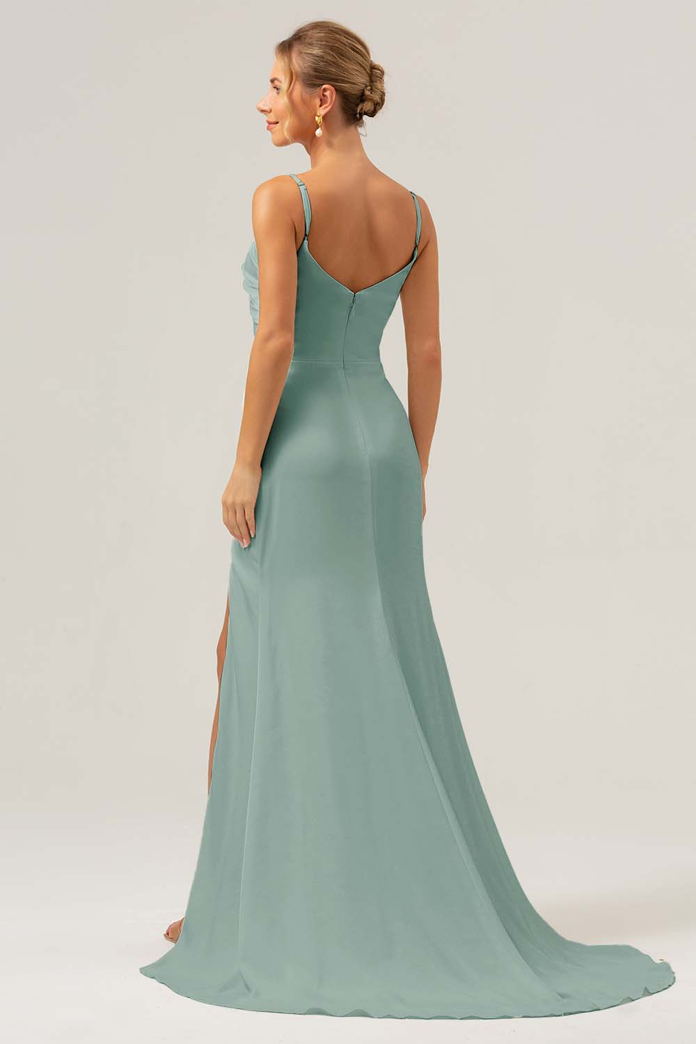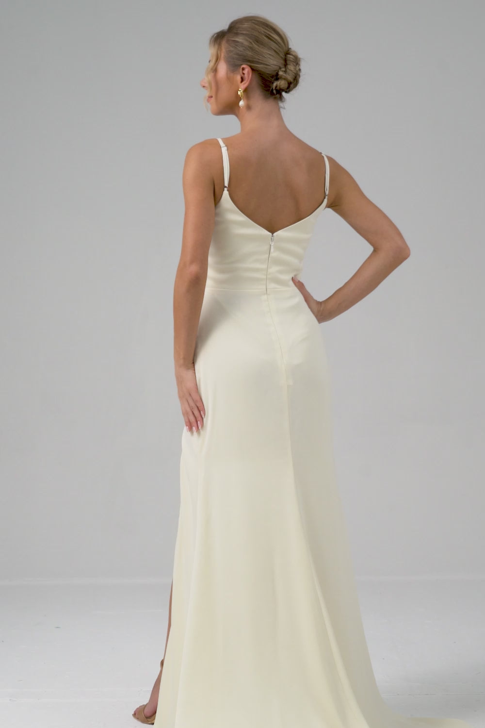 Elfenben Slida Spaghetti Remmar Rynkad Lång Satin Brudtärna Klänning Med Slits