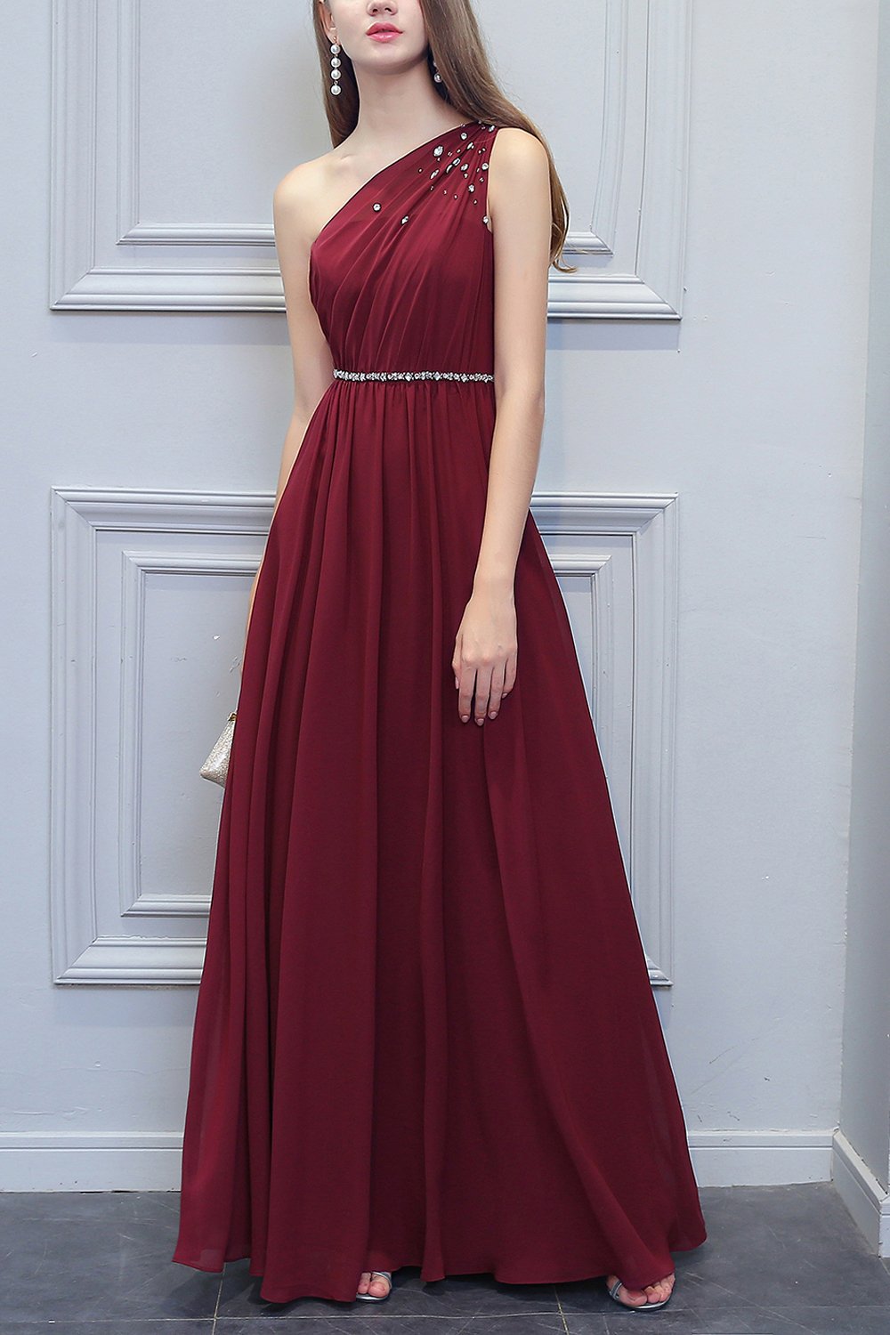 Enaxlad Lång Chiffong Brudtärneklänningar Med Pärlor