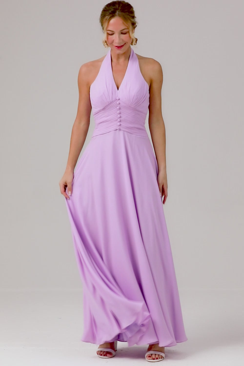 En linje halter chiffong rygglös lång lila brudtärna klänning