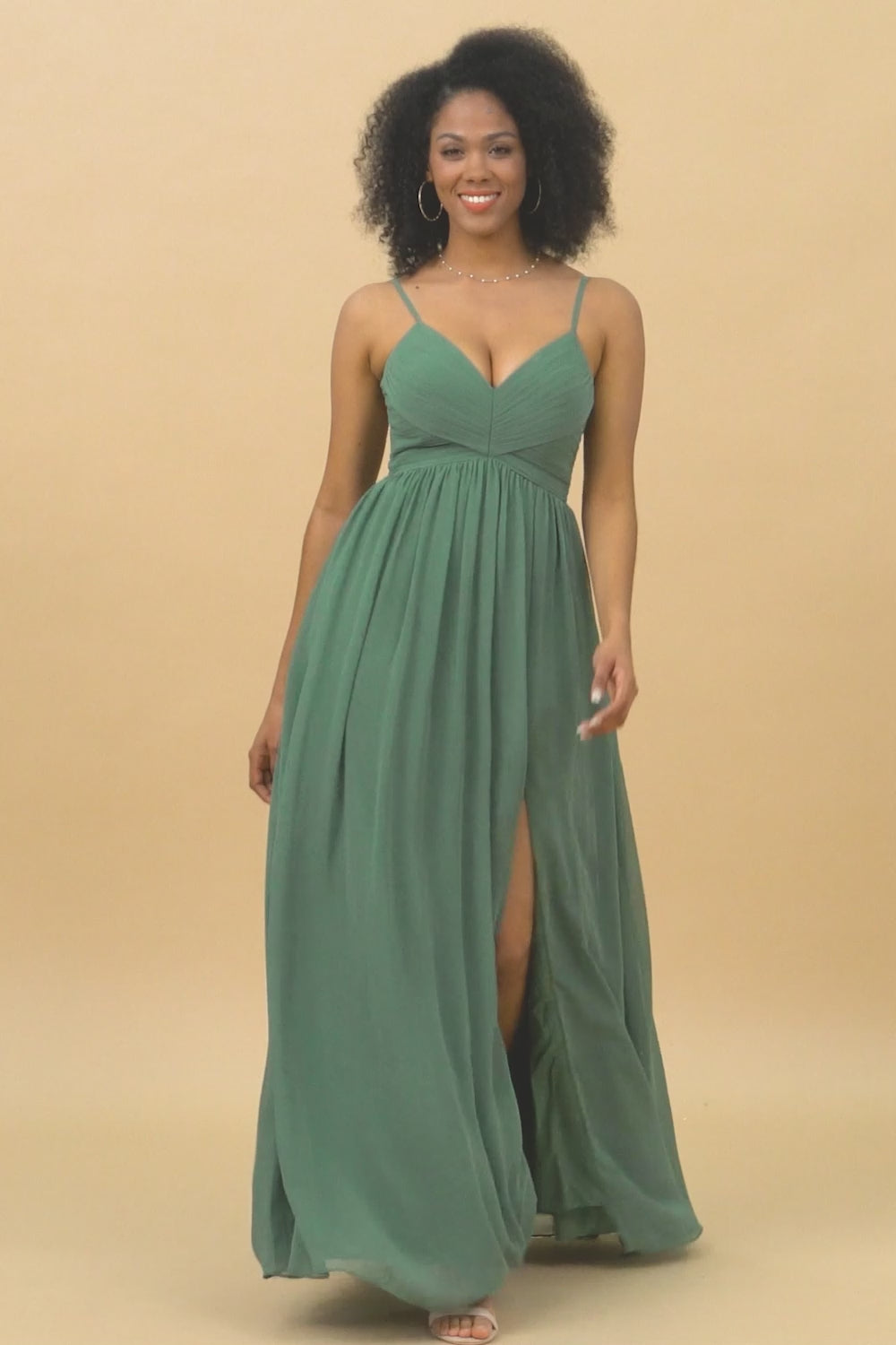 En linje spagetti remmar Eucalyptus lång brudtärna klänning med delad front
