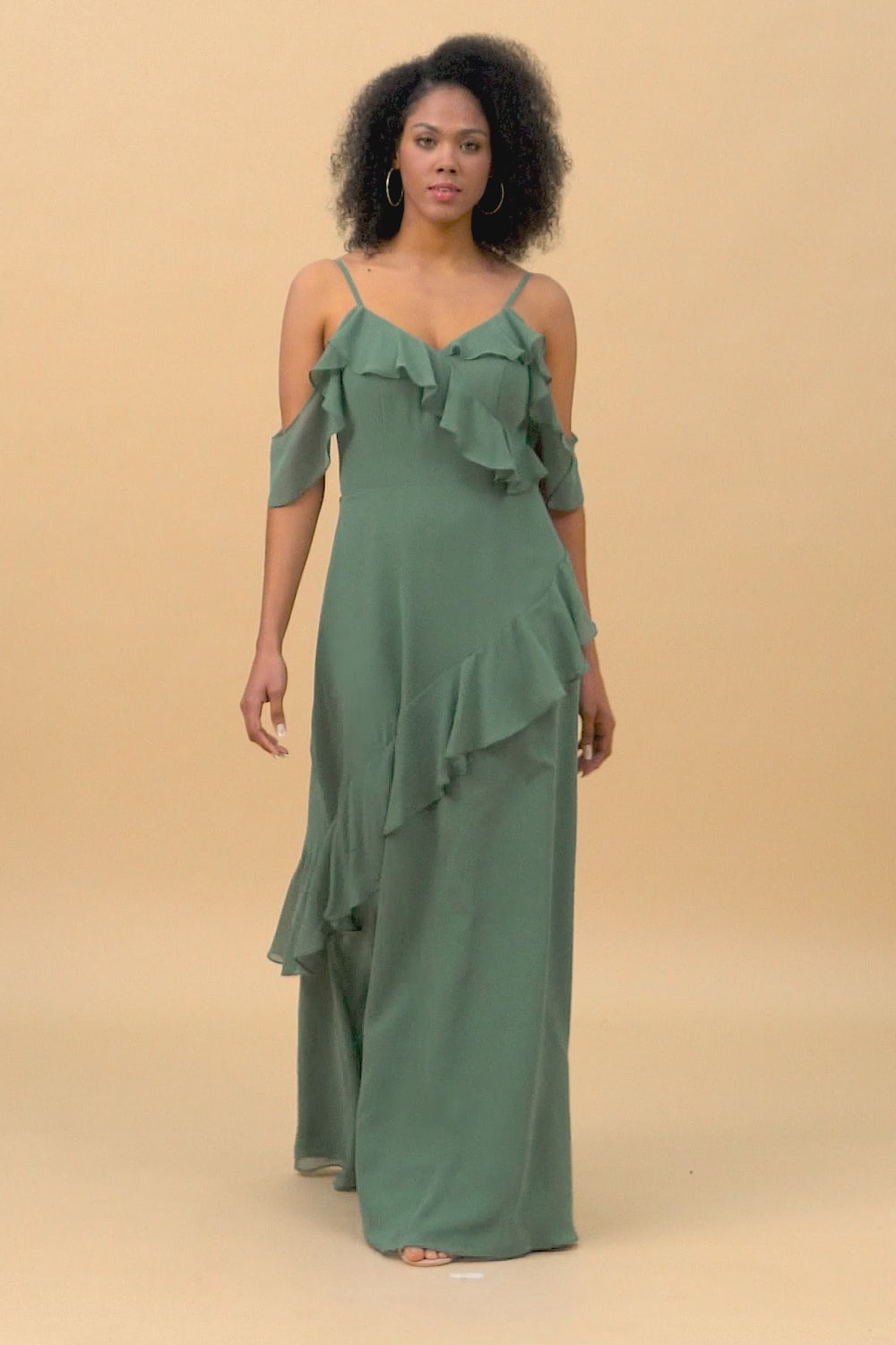 Eucalyptus Spaghetti Straps Long Bridesmaid Klänning med Ruffles